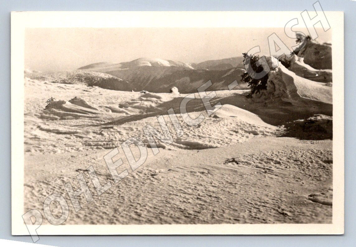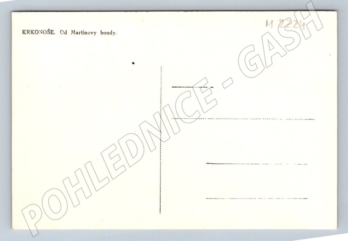 Originální černobílá pohlednice zobrazující zimní krajinu v Krkonoších, pořízenou od Martinovy boudy. Snímek zachycuje zasněžené svahy, zakryté stromy a typické horské panorama. Jedná se o malý formát pohlednice z období do roku 1950. Rubová strana je čistá, bez známky použití, nese pouze popis KRKONOŠE. Od Martinovy boudy. Vhodné pro sběratele historických pohlednic nebo milovníky Krkonoš.