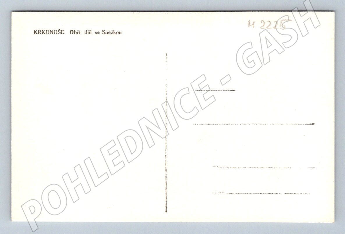 Originální černobílá pohlednice s motivem Krkonoš – Obří důl se Sněžkou. Pohlednice zachycuje zimní scenérii horského údolí, s roubenými chalupami v popředí, zasněženými stromy a majestátními vrcholky hor v pozadí. Na zadní straně je předtisk pro adresu a text, v horní části je uveden popis místa: KRKONOŠE. Obří důl se Sněžkou . Pohlednice není prošlá poštou, ve velmi pěkném sběratelském stavu bez známek a textu. Výborný doplněk sbírky historických pohlednic z českých hor.