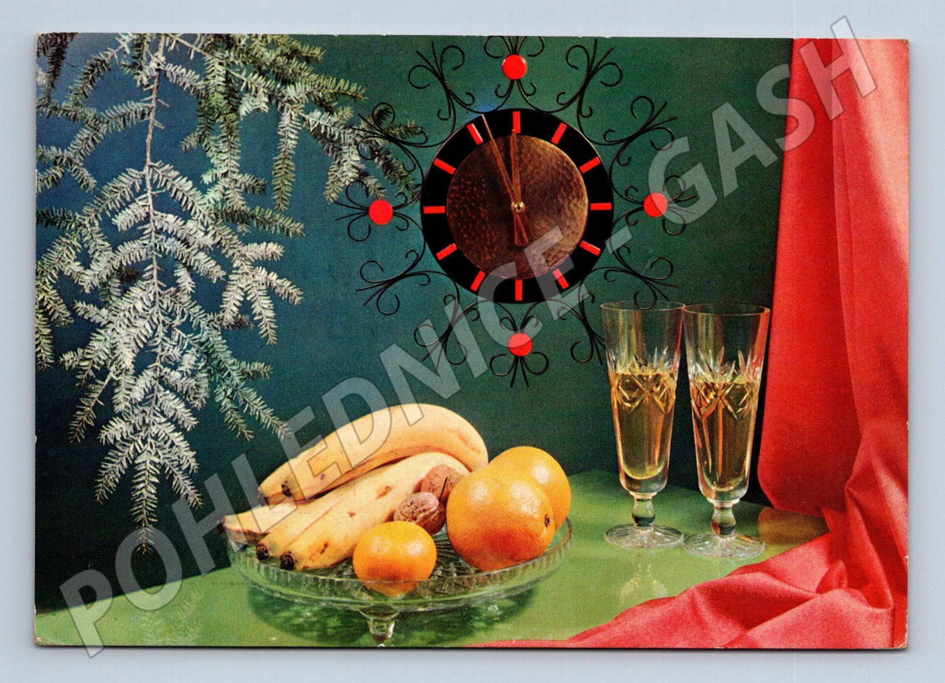 Pohlednice Novoroční zátiší hodiny ovoce 1975 (M22307)