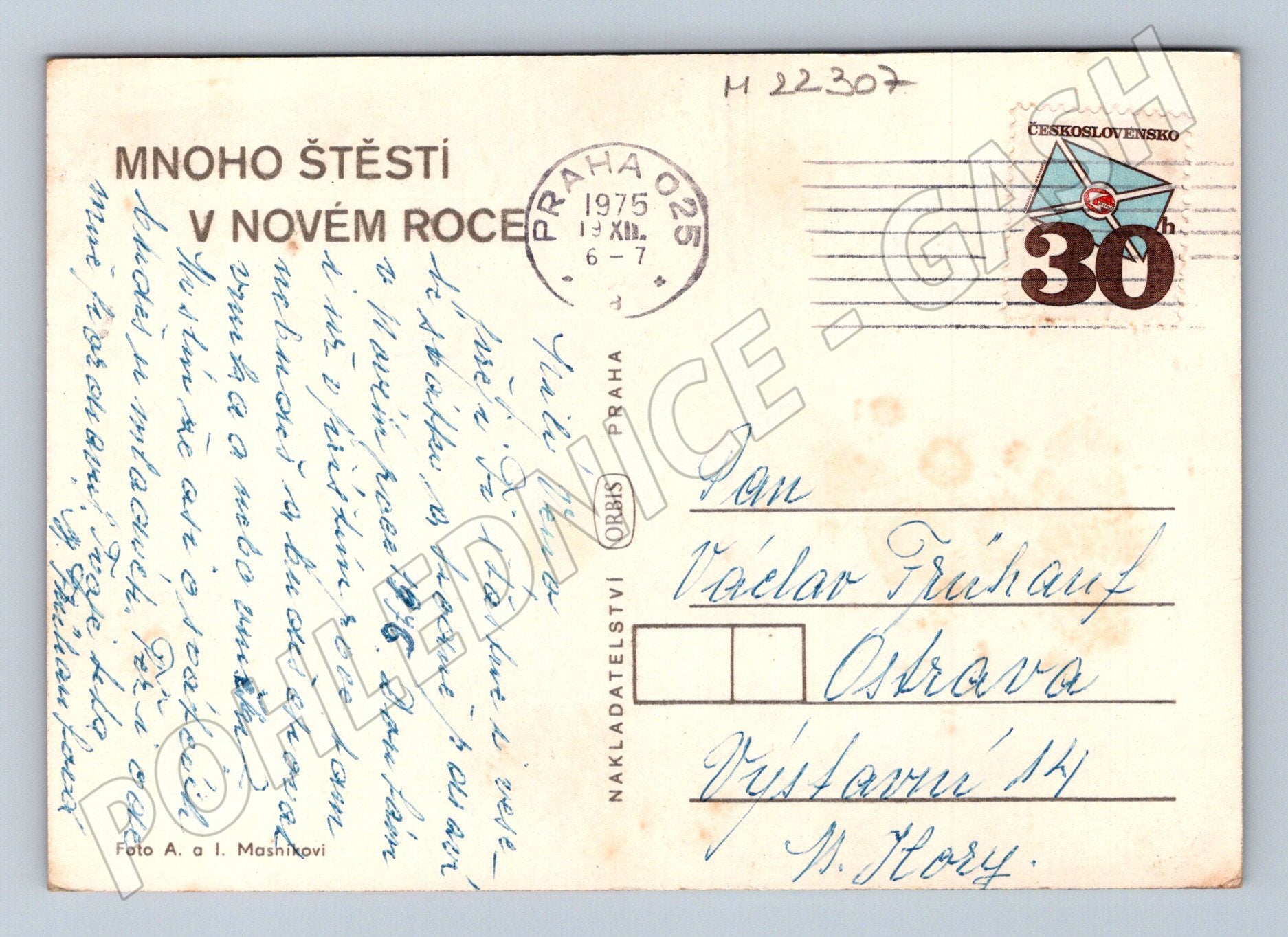 Na zadní straně je natištěn text „MNOHO ŠTĚSTÍ V NOVÉM ROCE“. Pohlednice má poštovní razítko „PRAHA“ z roku 1975, den 19.XII. Je zde nalepena známka „ČESKOSLOVENSKO“ s hodnotou 30. Vydavatel „NAKLADATELSTVÍ (ORBIS) PRAHA“. Adresa je ručně psaná „Pan Václav Trühauf Ostrava Pustkovec 14 P. Stary.“. Je zde také delší ručně psaný text s datem 1976 a jménem „Foto A. a I. Mashkovi“.