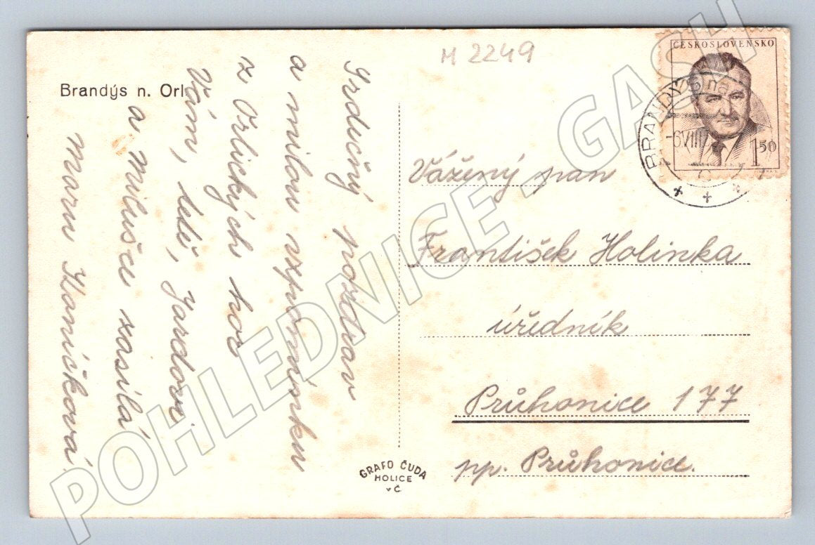 Originální stará pohlednice s motivem krajiny a železnice z Brandýsa nad Orlicí. Na pohlednici je zachycen malebný pohled na údolí řeky Orlice s železniční tratí, která je charakteristickým prvkem této oblasti. Pohlednice je vytištěna v černobílém provedení a její stáří dokládá i použitá známka a razítko z období první poloviny 20. století. Pohlednice byla zaslána, na zadní straně je původní ručně psaný text a adresa adresáta. Jedná se o autentický sběratelský kus vhodný pro filokartisty a milovníky historických pohlednic z českého území.