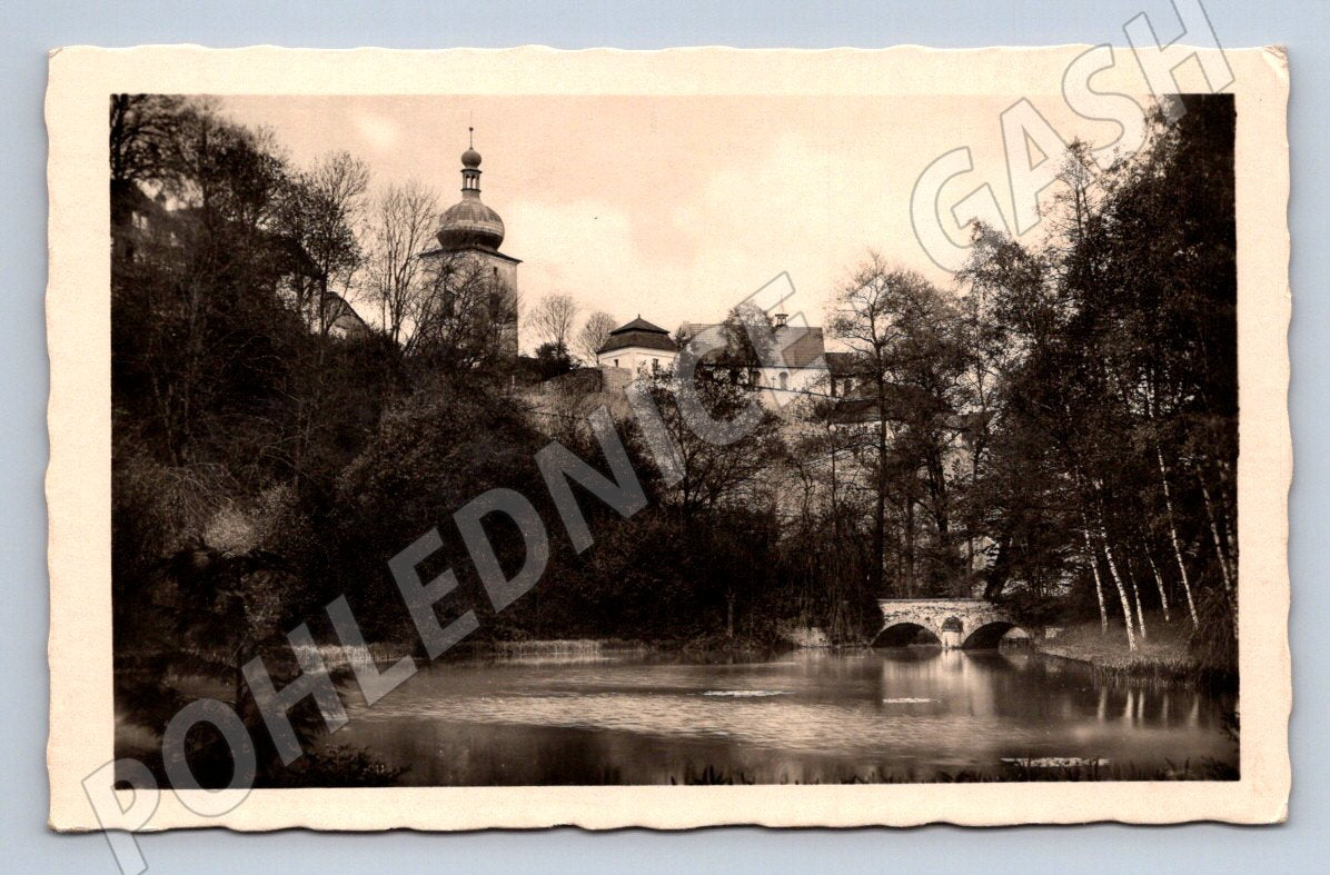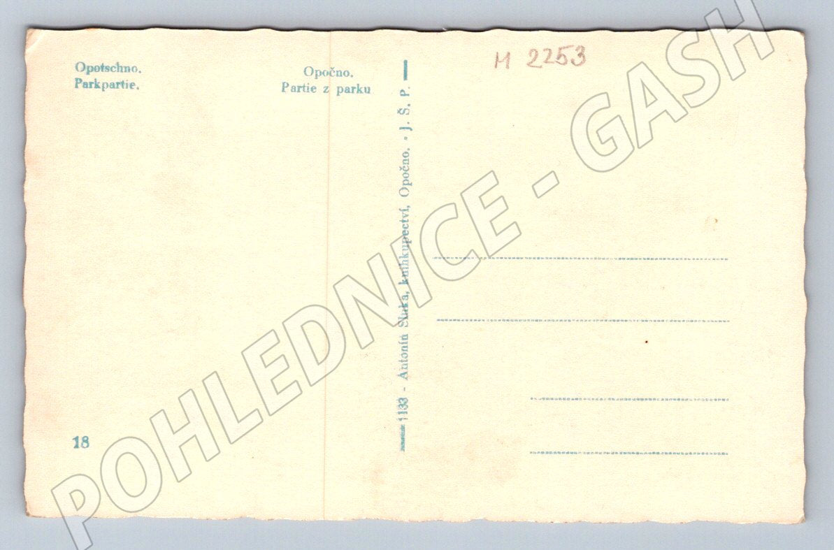 Originální stará pohlednice zobrazující malebnou partii zámeckého parku v Opočně. Na fotografii je zachycen Opočenský zámek s charakteristickou věží, okolní zeleň a romantický kamenný mostek přes vodní plochu. Pohlednice je neprošlá poštou, ve velmi pěkném sběratelském stavu, s drobnými stopami stáří. Na zadní straně je uveden popis Opočno. Partie z parku a vydavatelství Ant. Stula, knihkupectví Opočno. Skvělý kousek do sbírky pohlednic s motivy českých zámků a parků.
