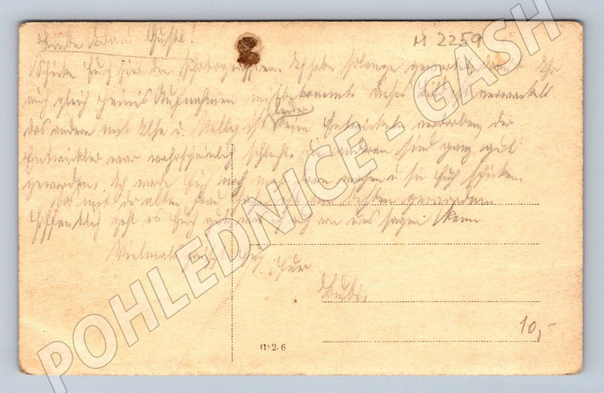 Staré sepia pohlednice s motivem dítěte v zahradě, sedícího na židličce u domu, zatímco před ním leží malý pejsek. Snímek zachycuje atmosféru začátku 20. století nebo konce 19. století. Na zadní straně je ručně psaný vzkaz v německém jazyce, pohlednice má klasické známky stáří – zahnědlý tón, mírné ohyby v rozích a drobné skvrny. Ideální pro sběratele historických pohlednic, milovníky dobových zvířecích motivů nebo jako nostalgický dekorativní prvek. Rozměr odpovídá běžnému staršímu formátu, pohlednice není prošlá poštou.