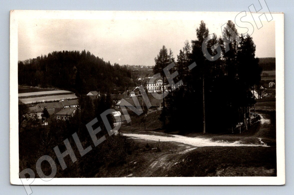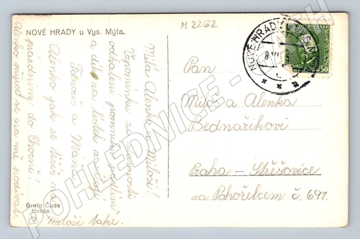 Originální stará pohlednice s pohledem na Nové Hrady u Vysokého Mýta. Na pohlednici je černobílý záběr na malebnou vesnici se zalesněným kopcem v pozadí a několika domky v popředí, silnička a venkovské prostředí. Pohlednice byla skutečně odeslaná, na zadní straně je známka a razítko s datací, ručně psaný vzkaz i adresa adresáta. Vydavatel: Grafo Čuda Holice. Pohlednice je ve velmi dobrém sběratelském stavu, vhodná pro sběratele regionálních pohlednic či zájemce o historii českých obcí. Formát odpovídá starším pohlednicím, před rokem 1950.