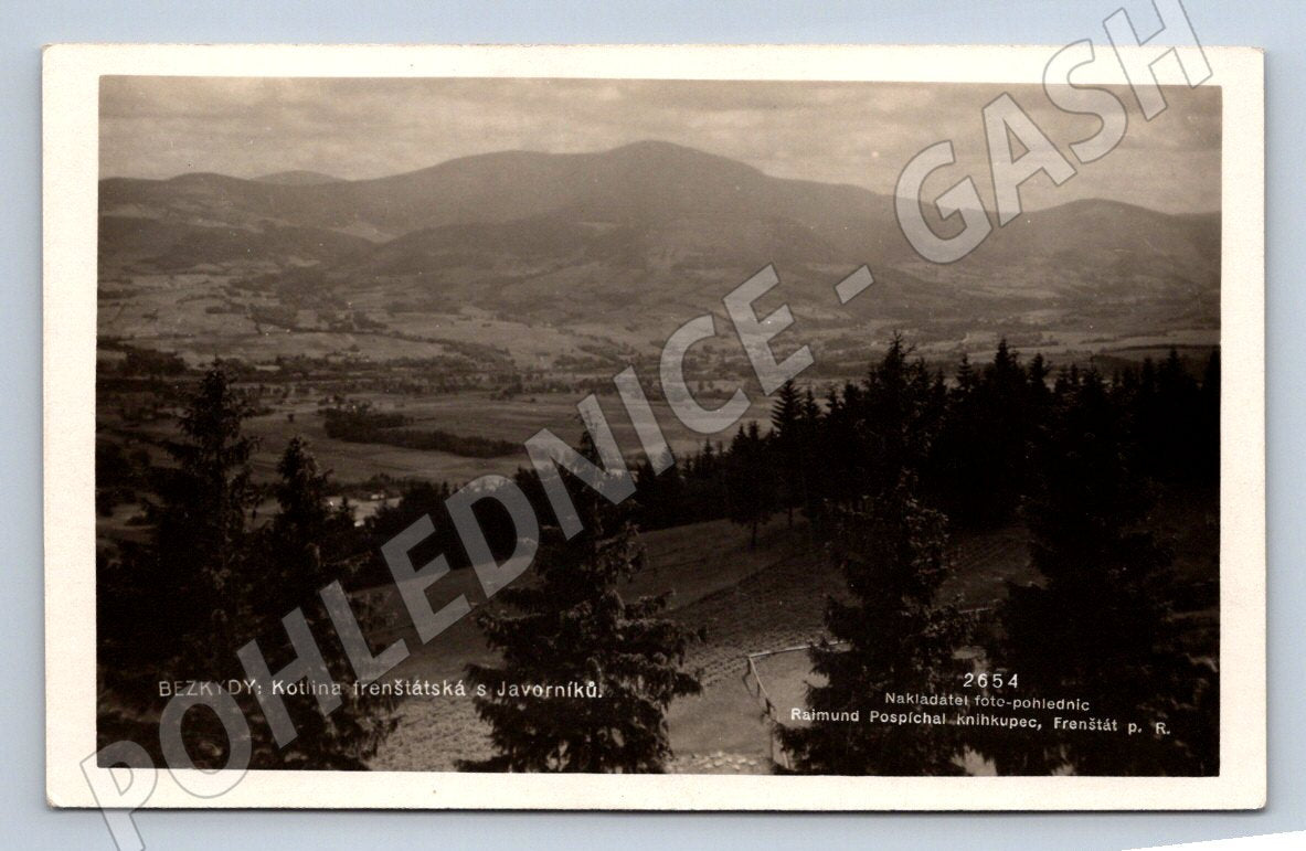 Starší černobílá pohlednice s motivem Beskyd - Kotlina frenštátská s Javorníku. Na pohlednici je patrná malebná horská krajina, pohled shora s borovicemi v popředí a horským masivem v pozadí. Vydavatel: Raimund Pospíchal, knihkupec, Frenštát p. R. Pohlednice nebyla dosud použita (neprošlá poštou), zadní strana je čistá, pouze s drobným ručním popisem. Velmi dobrý stav, vhodné pro sběratele pohlednic s tématikou Moravy, Beskyd či staré fotografie české krajiny.