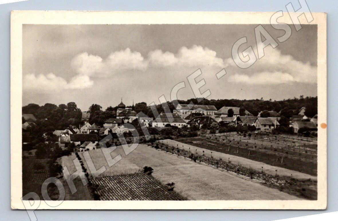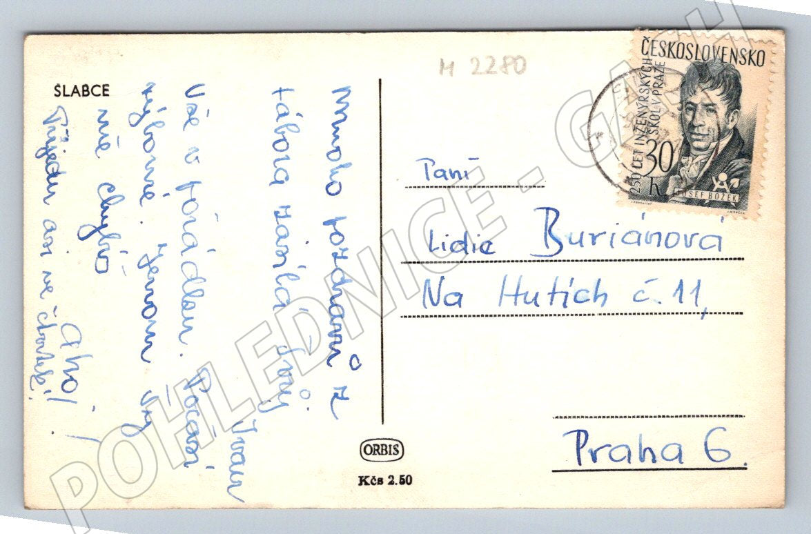 Originální černobílá pohlednice obce Slabce, která zachycuje panoramatický pohled na obec s dominantou kostela a okolní krajinou. Pohlednice je použitá, prošla poštou, na zadní straně je ručně psaný vzkaz a poštovní známka Československo s portrétem Josefa Božka. Odesláno do Prahy 6. Velmi pěkný stav, vhodné pro sběratele historických pohlednic z českých obcí. Formát malý, vydavatel Orbis, cena 2,50 Kčs. Skvělý sběratelský kousek s autentickou historií.