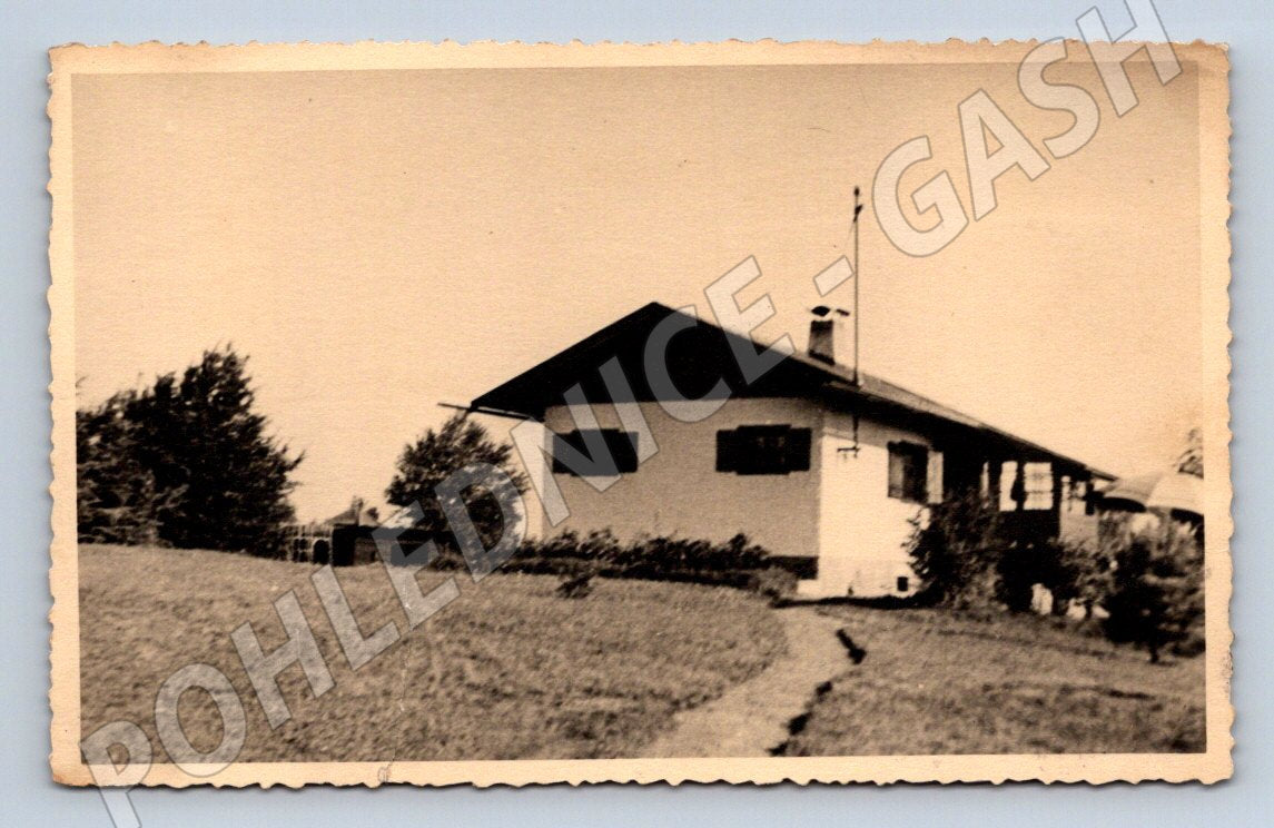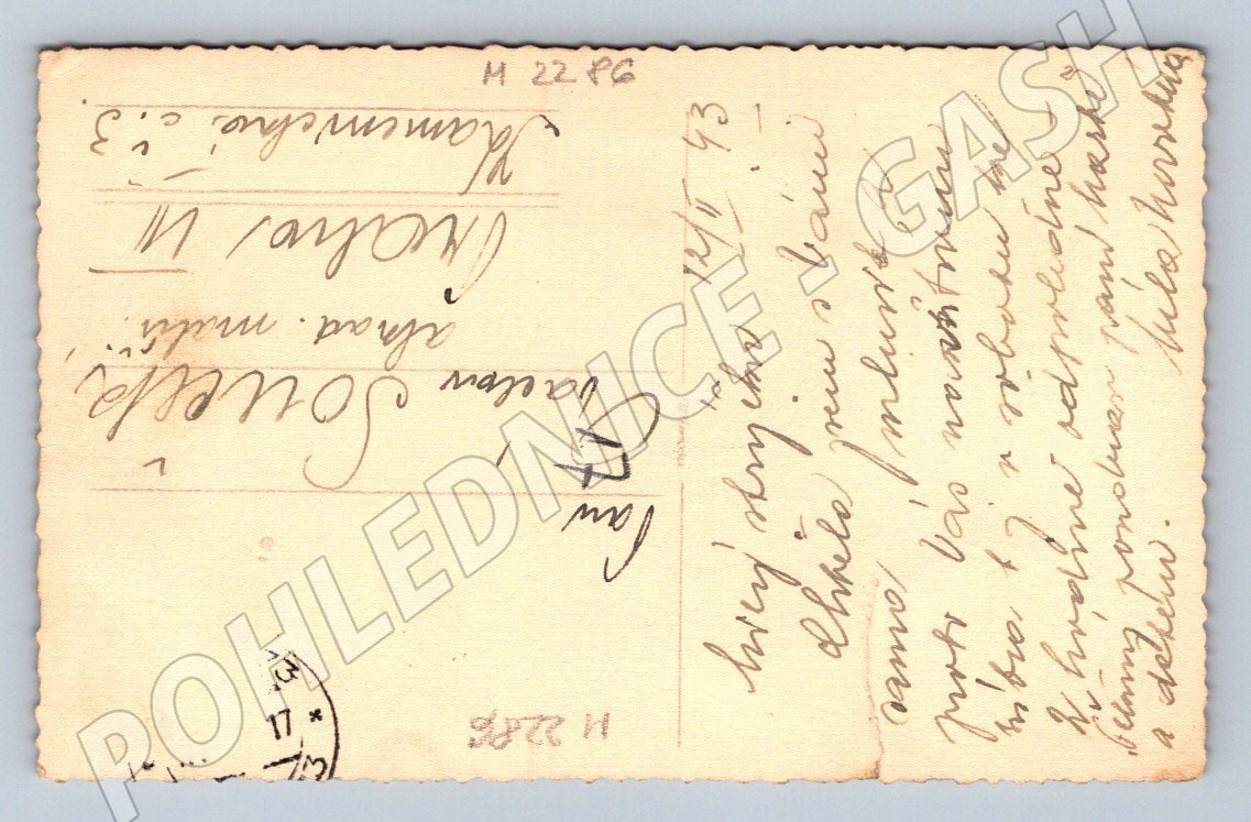 Originální historická pohlednice malého formátu s černobílým snímkem rodinného domu se zahradou. Pohlednice je opatřena ručně psaným vzkazem a byla skutečně odeslána poštou, jak dokládá razítko na zadní straně. Jedná se o zajímavý sběratelský kousek, který zachycuje typickou architekturu a atmosféru českého venkova první poloviny 20. století. Pohlednice má mírně zvlněné okraje, odpovídající stáří a době vzniku. Skvělý přírůstek do sbírky historických pohlednic z Čech.