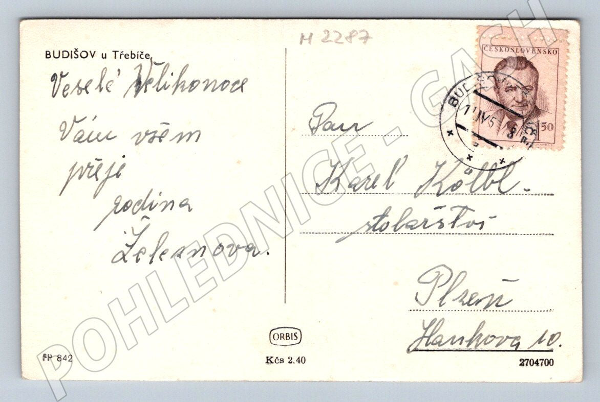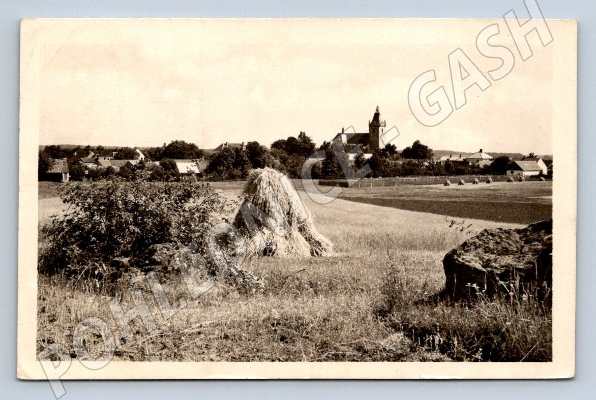Originální stará pohlednice obce Budišov u Třebíče. Pohled na malebnou krajinu s dominantou místního kostela, ve kterém zaujmou snopy sena na poli a vesnické stavby v pozadí. Pohlednice prošla poštou, s razítkem a známkou z období ČSR. Na zadní straně je ručně psaný velikonoční pozdrav adresovaný do Plzně. Signováno rodinou Železného. Výborný sběratelský stav, vhodné pro sběratele historických pohlednic z českých vesnic a regionů.