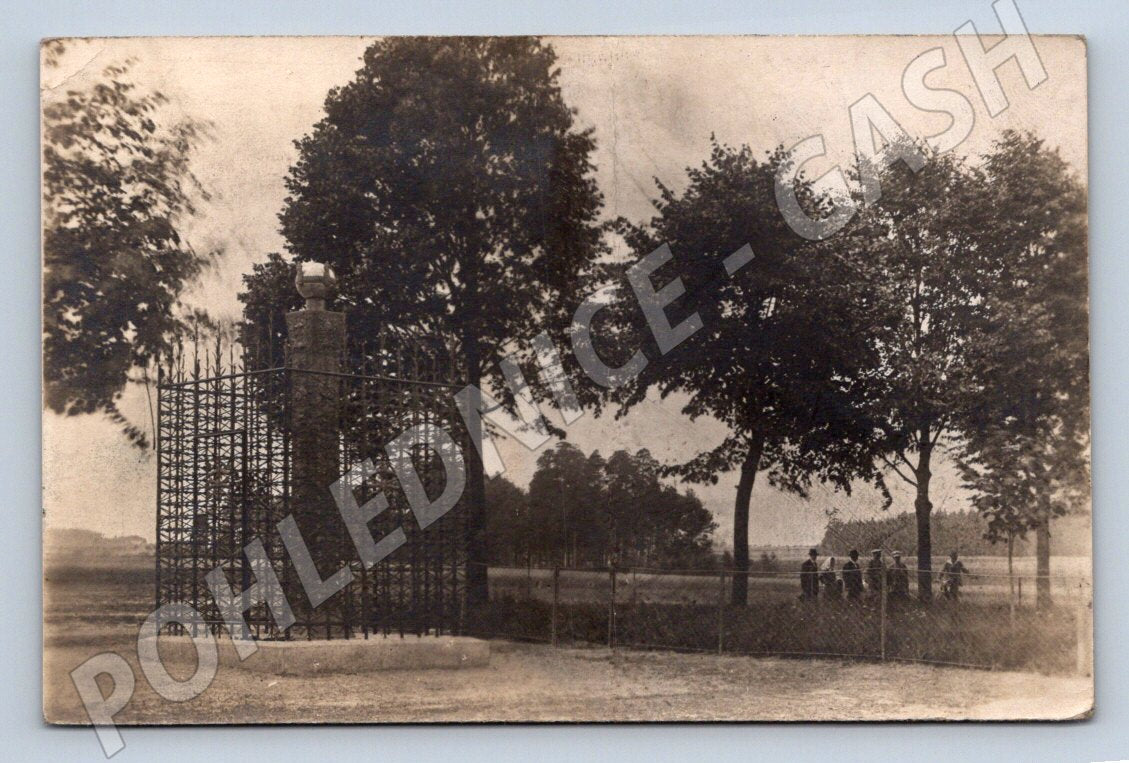 Starý černobílý pohled na památník na venkově, obklopený stromy a ohrazený kovovým plotem. V pozadí lze vidět pole a několik postav stojících pod stromy. Jedná se o historickou pohlednici z období první poloviny 20. století. Na zadní straně je ručně psaná zpráva, poštovní známka ČSR a razítko. Pohlednice je ve sběratelském stavu, odřené rohy odpovídající stáří. Vhodné pro sběratele historických pohlednic či zájemce o regionální dějiny.