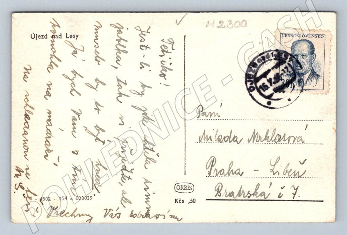 Originální stará pohlednice s motivem budovy školy v obci Újezd nad Lesy. Pohlednice byla odeslaná a poštovně orazítkovaná, s autentickou známkou Československo a rukou psaným textem adresovaným do Prahy. Celkový stav velmi dobrý, běžné známky stáří, drobné opotřebení rohů. Výborný sběratelský kousek pro milovníky starých pohlednic z českých měst a vesnic. Rozměr malý formát, vydavatel ORBIS, cena 0,50 Kčs.