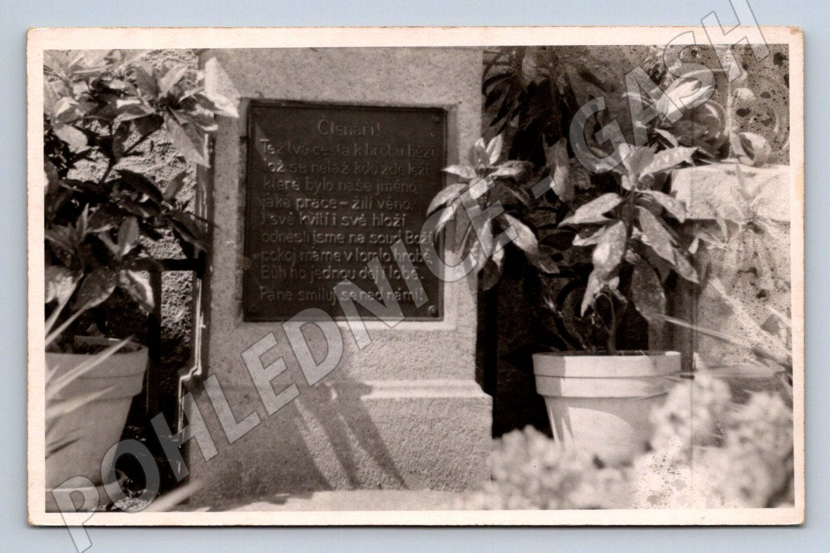 Originální černobílá pohlednice zobrazující Bačův pomník v Klenčí pod Čerchovem. Na přední straně je detail pamětní desky obklopené květinami v květináčích. Zadní strana je popsána ručně: Bačův pomník v Klenčí . Pohlednice je ve velmi dobrém stavu s lehkými stopami stáří, bez viditelných poškození. Jedná se o zajímavý sběratelský kousek s regionální tématikou, vhodný pro milovníky českých památek a historie.