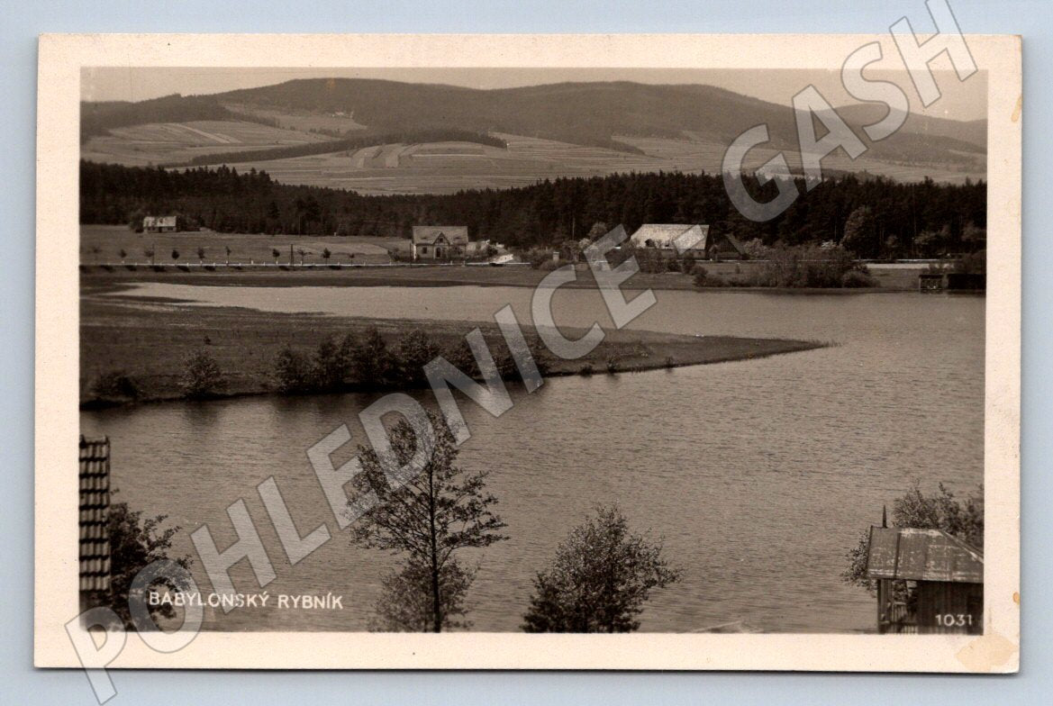Originální černobílá pohlednice s motivem Babylonského rybníka v malebné krajině České republiky. Na snímku je zachycena vodní hladina rybníka obklopená stromy, loukami a venkovskými staveními, v pozadí s lesy a kopci. Na přední straně pohlednice je označení BABYLONSKÝ RYBNÍK a číslo 1031, na zadní straně je předtisk pro známku a adresu. Nakladatel: V. Rybařík, knihkupectví Domažlice, tisk: V. Čermák, Praha-Koširře. Pohlednice je ve velmi dobrém stavu, bez zásadního poškození, pouze lehké otěry rožků. Skvělý sběratelský kousek z období první poloviny 20. století.
