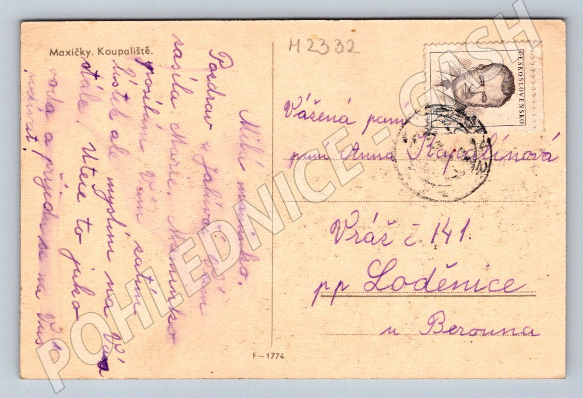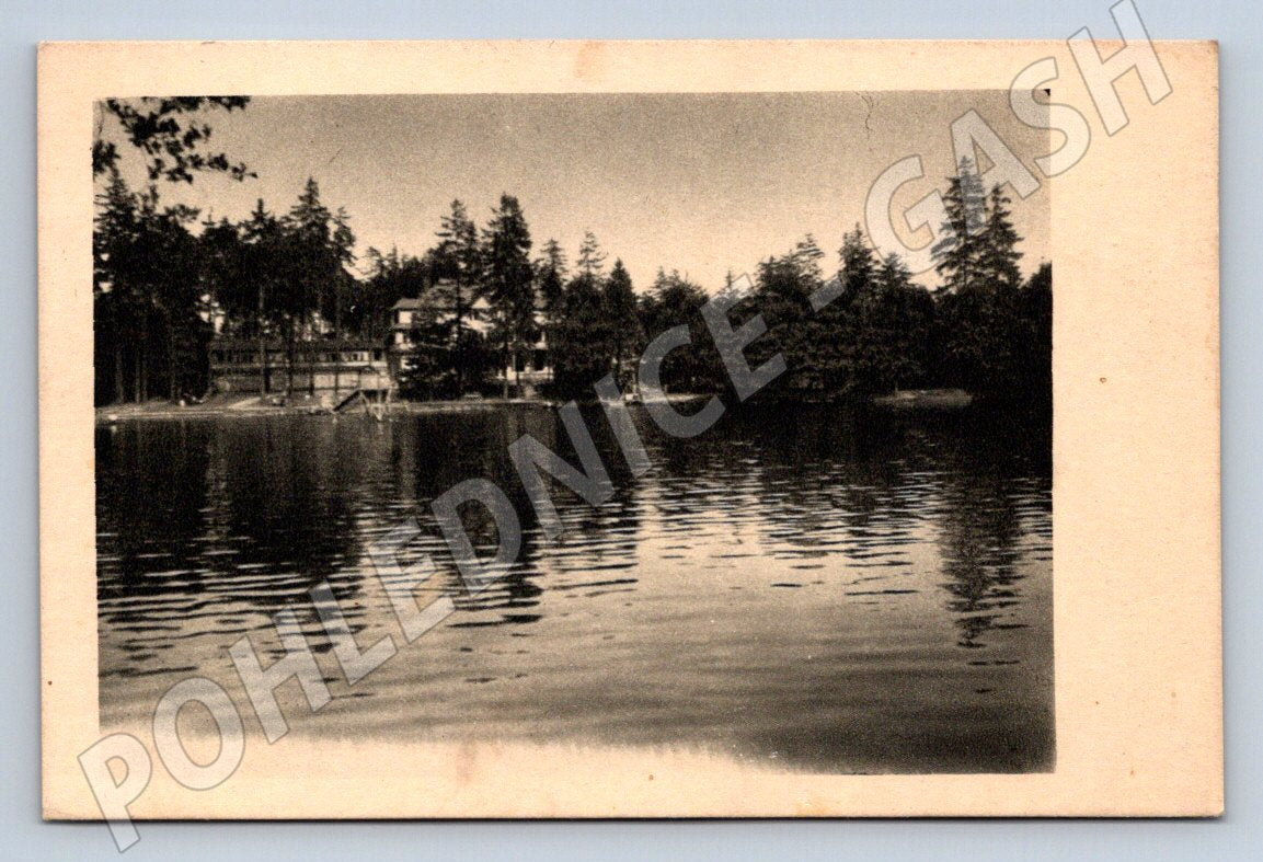 Originální stará pohlednice z období před rokem 1950, zobrazující koupaliště Maxišky v České republice. Na přední straně se nachází černobílý snímek budovy a lesa u jezera, typického pro původní českou rekreační místa. Zadní strana je popsána rukou, včetně poštovní známky a adresy, což dokládá její použití a dobovou autentičnost. Ideální pro sběratele historických pohlednic či zájemce o českou historii a lázeňství. Stav dle skenu – pohlednice nese známky stáří a mírného opotřebení.