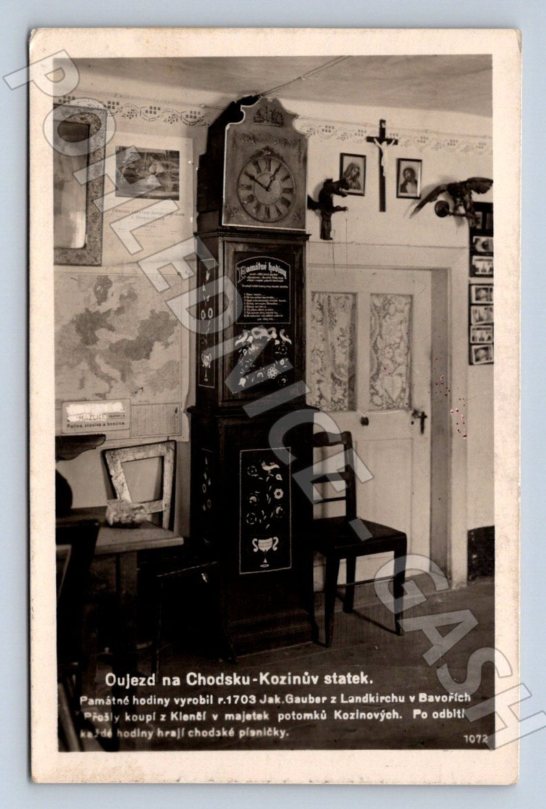Historická černobílá pohlednice zobrazující interiér Kozinova statku v obci Újezd na Chodsku. Na pohlednici dominuje památná chodská hodina z roku 1730, jejíž původ je popsán i v doprovodném textu na přední straně. Okolní interiér je zdobený obrazy, vyřezávanými dekoracemi a dalšími dobovými předměty. Pohlednice byla skutečně odeslána, na zadní straně je známka, razítko a ručně psaný vzkaz (datováno 1937). Pohlednice vhodná pro sběratele regionálních motivů a zájemce o Chodsko a lidovou kulturu.
