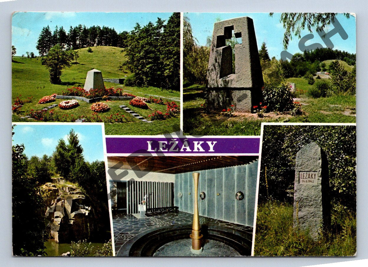 Originální pohlednice s motivem památníku Ležáky, místa vyhlazeného nacisty během druhé světové války. Pohlednice zachycuje památník s obrysy původních domů, pomníky a pietní místa. Na zadní straně je vytištěn historický popis události, která se zde odehrála 24. června 1942, kdy byla osada a jejích 54 obyvatel vypálena nacisty. Pohlednice má razítko a známku z roku 1988. Jedná se o atraktivní sběratelský kousek pro milovníky historie a čs. památek. Stav viz foto.