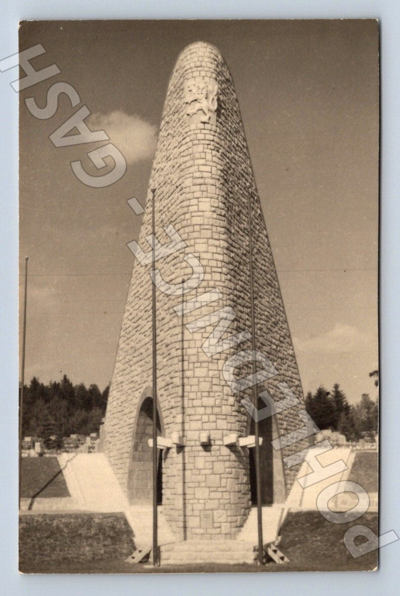 Originální černobílá pohlednice zachycující Památník hrdinů Dukly na Dukle. Typické meziválečné vydání v malém formátu, stáří pohlednice odpovídá období první poloviny 20. století. Na pohlednici je zachycena monumentální stavba s výrazným lví reliéfem na špičce památníku. Rub je čistý, pouze s rukopisnou poznámkou. Vhodné pro sběratele historických pohlednic s tématikou československých památníků a pamětihodností.