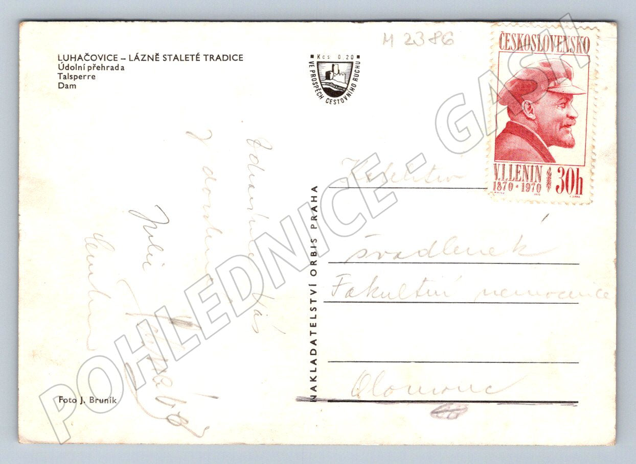 Originální pohlednice zobrazující letní rekreační atmosféru u vodní nádrže – údolní přehrada Luhačovice. Na pohlednici je malebný pohled na přehradu s plavci, loďkami a lidmi odpočívajícími na břehu, v pozadí je krásná krajina chráněná lesními kopci. Na zadní straně byla odeslána poštou, opatřena známkou s Leninovým portrétem (Československo) a ručně psaným vzkazem. Vydavatel: Orbis Praha, foto J. Bruník. Skvělý sběratelský kousek dokumentující život a rekreaci v období Československa.