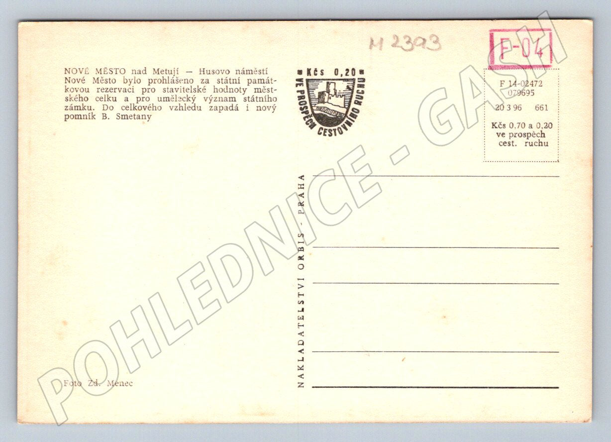 Originální černobílá pohlednice zachycující historické Husovo náměstí v Novém Městě nad Metují s dominantou renesanční radnice a sochou Bedřicha Smetany v popředí. Pohlednice byla vydána státním nakladatelstvím Orbis Praha, autorem fotografie je Zd. Menec. Na zadní straně je krátký popis náměstí a informace o významu památkové rezervace a státního zámku. Stav pohlednice je velmi dobrý, bez známek použití. Ideální do sbírky, zvláště pro milovníky českých měst a historických objektů.