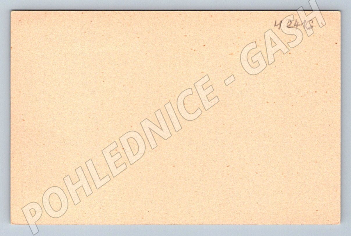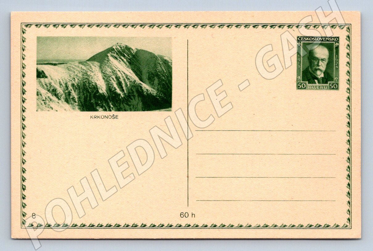 Starší nepoužitá poštovní pohlednice se zabudovaným motivem Krkonoš, vyobrazující horský masiv pokrytý sněhem. Vlevo nahoře je umístěna černobílá fotografie s popisem Krkonoše . V pravém horním rohu je předtištěná poštovní známka s portrétem T. G. Masaryka a nápisem ČESKOSLOVENSKO, nominální hodnota 50 haléřů. Na zadní straně není žádný text, jedná se o celistvost, která nebyla odeslána. Pohlednice je ve velmi dobrém a čistém stavu, bez popisů či zásahu. Odhadované stáří do roku 1950.