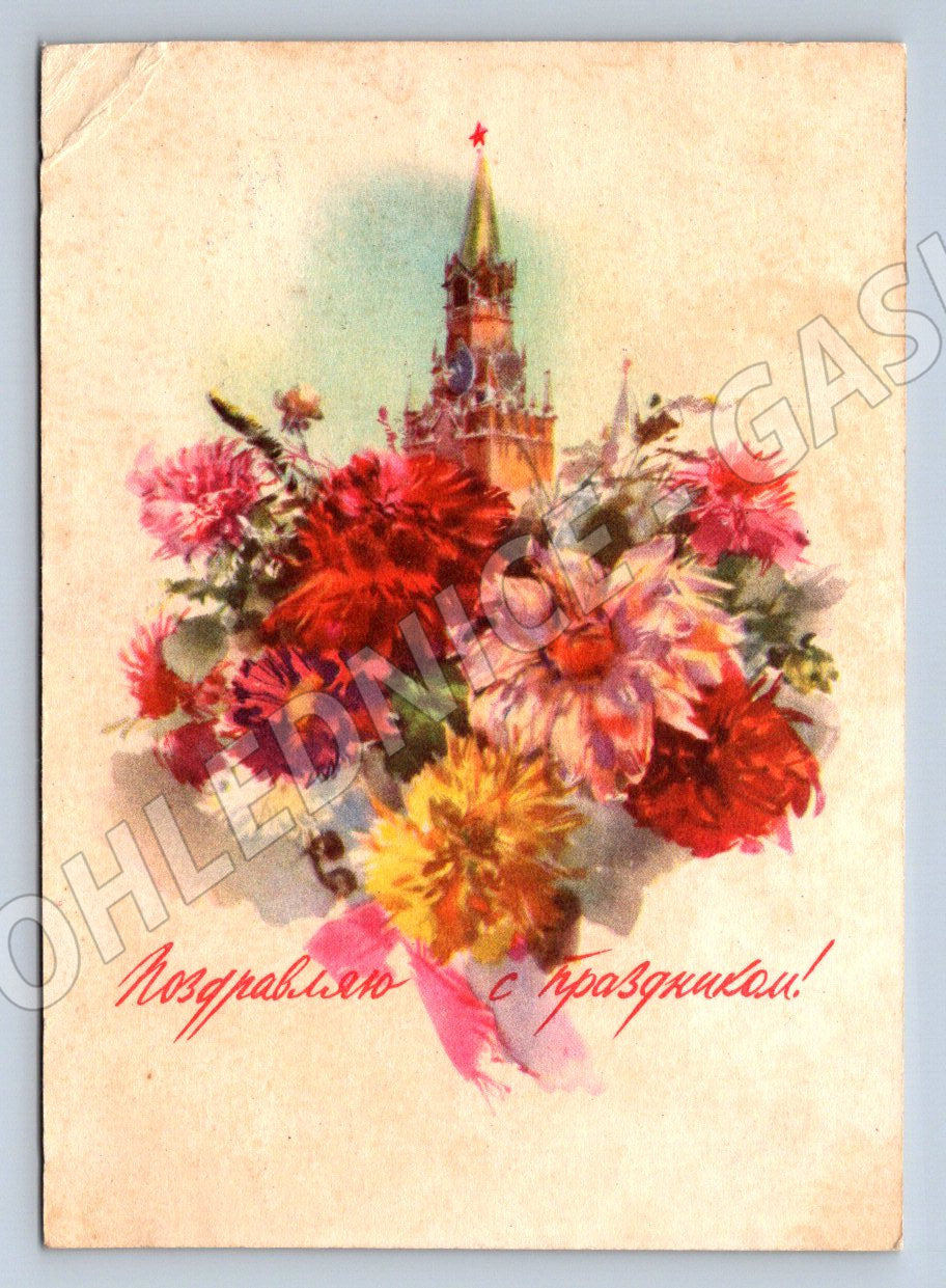 Nabízím k prodeji starou sovětskou pohlednici z roku 1957, československá aukce. Pohlednice zdobí barevná ilustrace kytic květin a části Kremlu s červenou hvězdou na věži. Na zadní straně je dobře čitelný ručně psaný vzkaz v ruštině, doplněný poštovní známkou a razítkem z období SSSR. Pohlednice je zachovalá, vhodná pro sběratele historických pohlednic a milovníky historie Sovětského svazu. Rozměry odpovídají standardní velikosti pohlednic z poloviny 20. století.