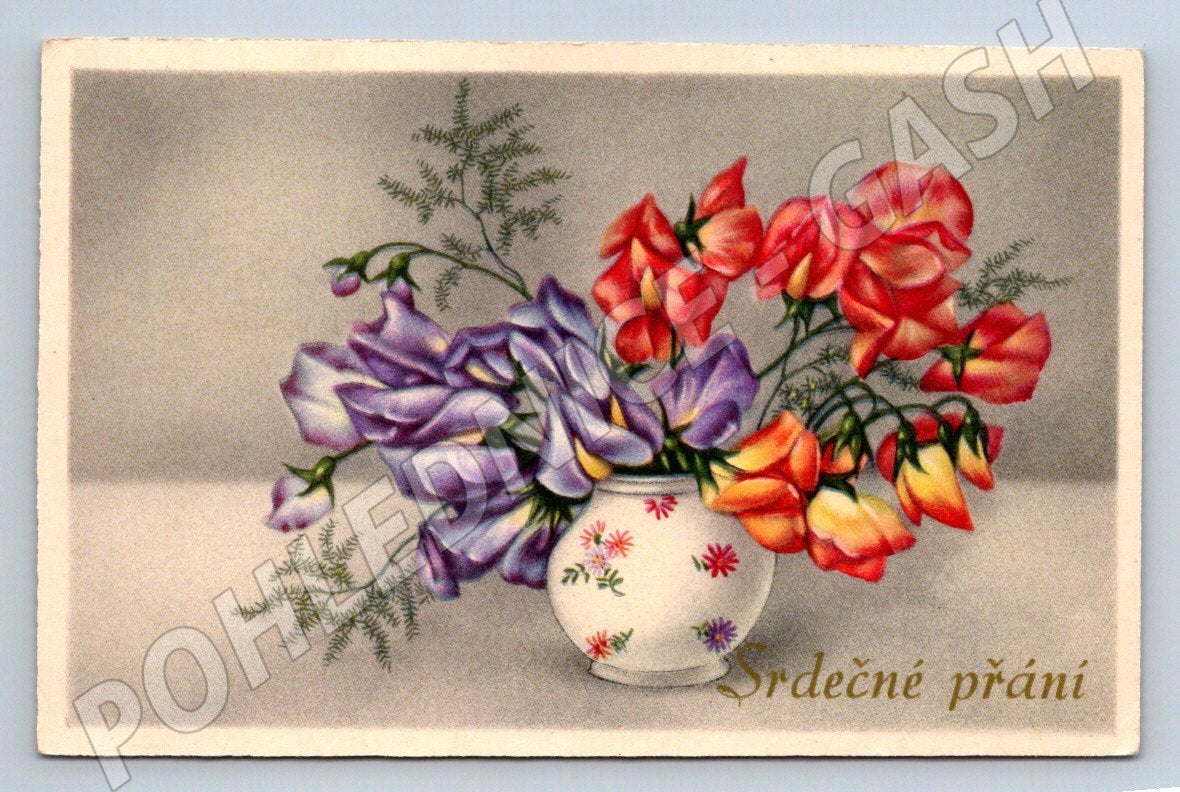 Pohlednice s barevnou kresbou vázy s květinami – fialově a oranžově zbarvenými květy na šedém pozadí. Nápis na pohlednici zní Srdečné přání . Pohlednice je nevyužitá, zadní strana je čistá bez psaní a razítka. Ideální sběratelský kousek nebo pro milovníky květinových motivů z oblasti etnografie.