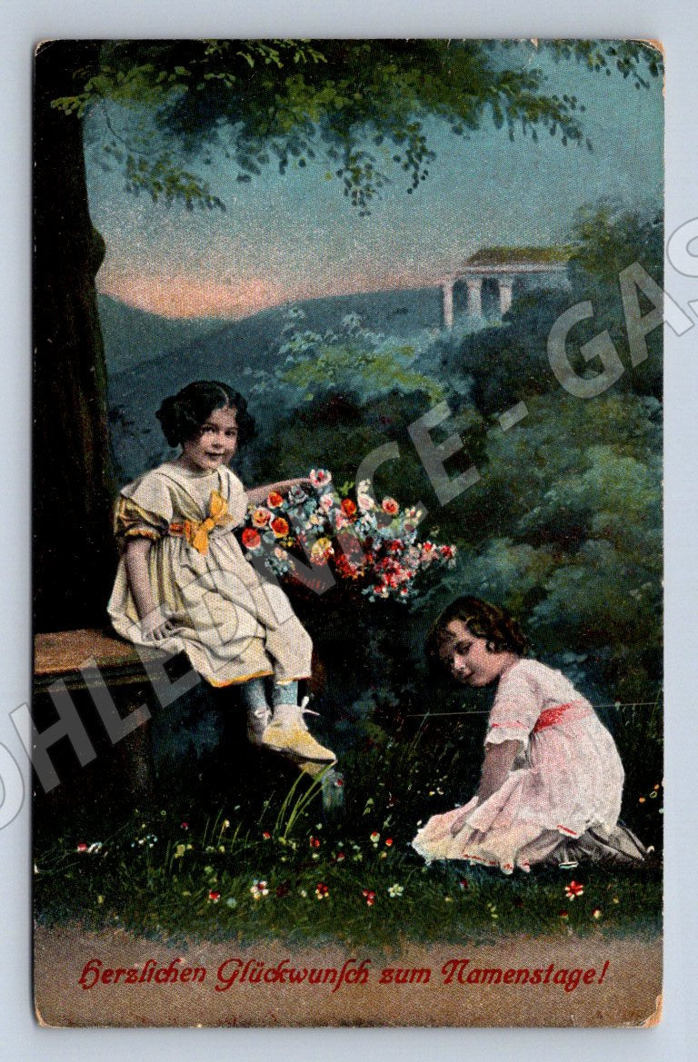 Krásná stará pohlednice zobrazující dvě dívky v tradičním oděvu sedící v přírodním prostředí u stromu a květin. Pohlednice je barevná, s jemnými detaily a nápisem v němčině Herzlichen Glückwunsch zum Namenstage! což znamená Srdečné přání k svátku jména . Pohlednice je v dobrém stavu s lehkým opotřebením rohů. Ideální k doplnění sbírky starých pohlednic a etnografických motivů. Na zadní straně bez psaní a razítek.