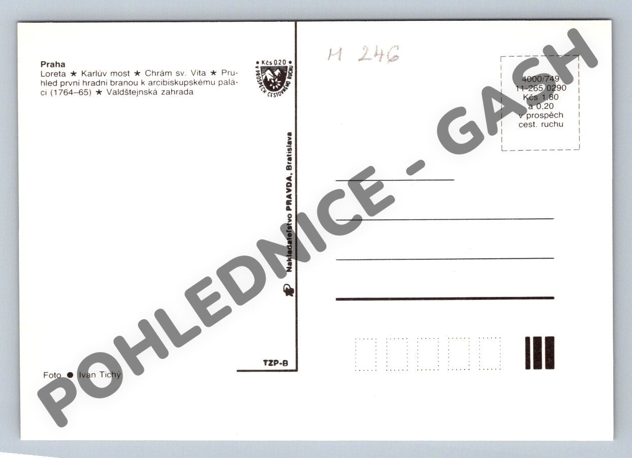 Barevná pohlednice s koláží ikonických památek hlavního města Prahy. Na přední straně pohlednice jsou zobrazeny známé motivy jako Karlův most, Chrám sv. Víta, Valdštejnská zahrada nebo historická panoramata Pražského hradu. Pohlednice je nevyplněná a ve velmi dobrém stavu, vhodná pro sběratele či jako stylový suvenýr. Zadní strana obsahuje stručný popis vyobrazených památek a tištěnou známku s cenou. Autor fotografie: Ivan Tichý. Vydavatelství Pravda, Bratislava.