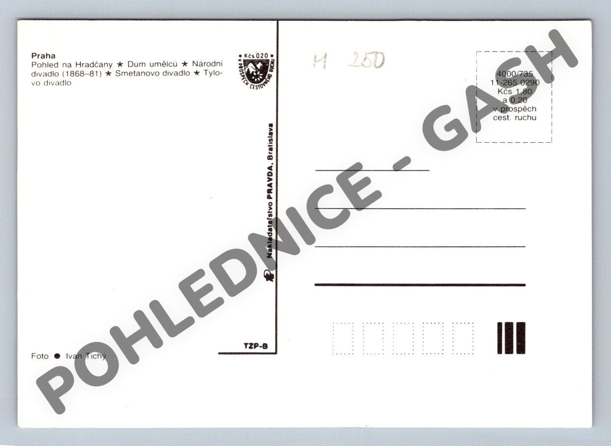 Barevná pohlednice z Prahy se čtyřmi fotografiemi významných pražských památek. Na pohlednici jsou vyobrazeny Hradčany, Dům umělců (Rudolfinum), Národní divadlo, Smetanovo divadlo a Tylovo divadlo. Tato pohlednice je typická pro období socialistického Československa. Fotografie pořídil Ivan Tichý, vydavatelem bylo nakladatelství PRAVDA Bratislava. Skvělý sběratelský kousek pro milovníky Prahy a historických pohlednic měst.