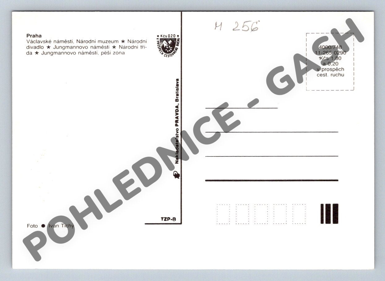Pohlednice se záběry z Prahy, zachycující významná místa jako Václavské náměstí, Národní muzeum, Národní divadlo či Jungmannovo náměstí. Koláž fotografií ukazuje architektonické a historické památky hlavního města v klasickém stylu pohlednic. Na zadní straně je vytištěn stručný popis jednotlivých motivů. Vydalo nakladatelství Pravda, Bratislava, foto Ivan Tichý. Výborný sběratelský stav, bez popisu a známky, vhodné pro sběratele historických pohlednic z Prahy i jako originální dárek.