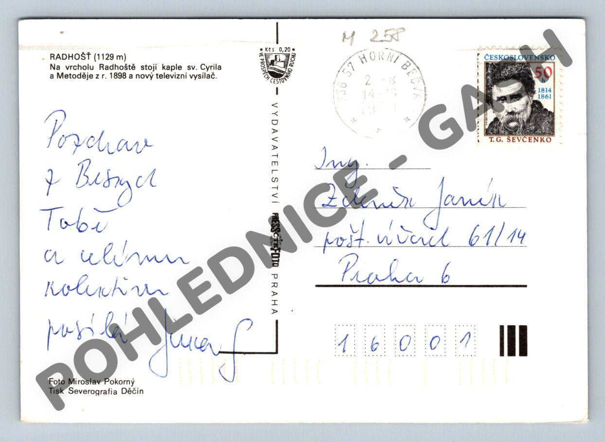 Originální pohlednice s motivem Radhoště, význačného beskydského vrcholu (1129 m n. m.). Na přední straně jsou barevné fotografie známých dominant: kaple sv. Cyrila a Metoděje, socha pohanského boha Radegasta, televizní vysílač i okolní malebná krajina. Zadní strana obsahuje osobní vzkaz i dobovou poštovní známku. Pohlednice byla vytištěna vydavatelstvím Pressfoto Praha. Atraktivní sběratelský kus dokumentující turistická místa a krajinu Beskyd v druhé polovině 20. století. Stav dle skenu.