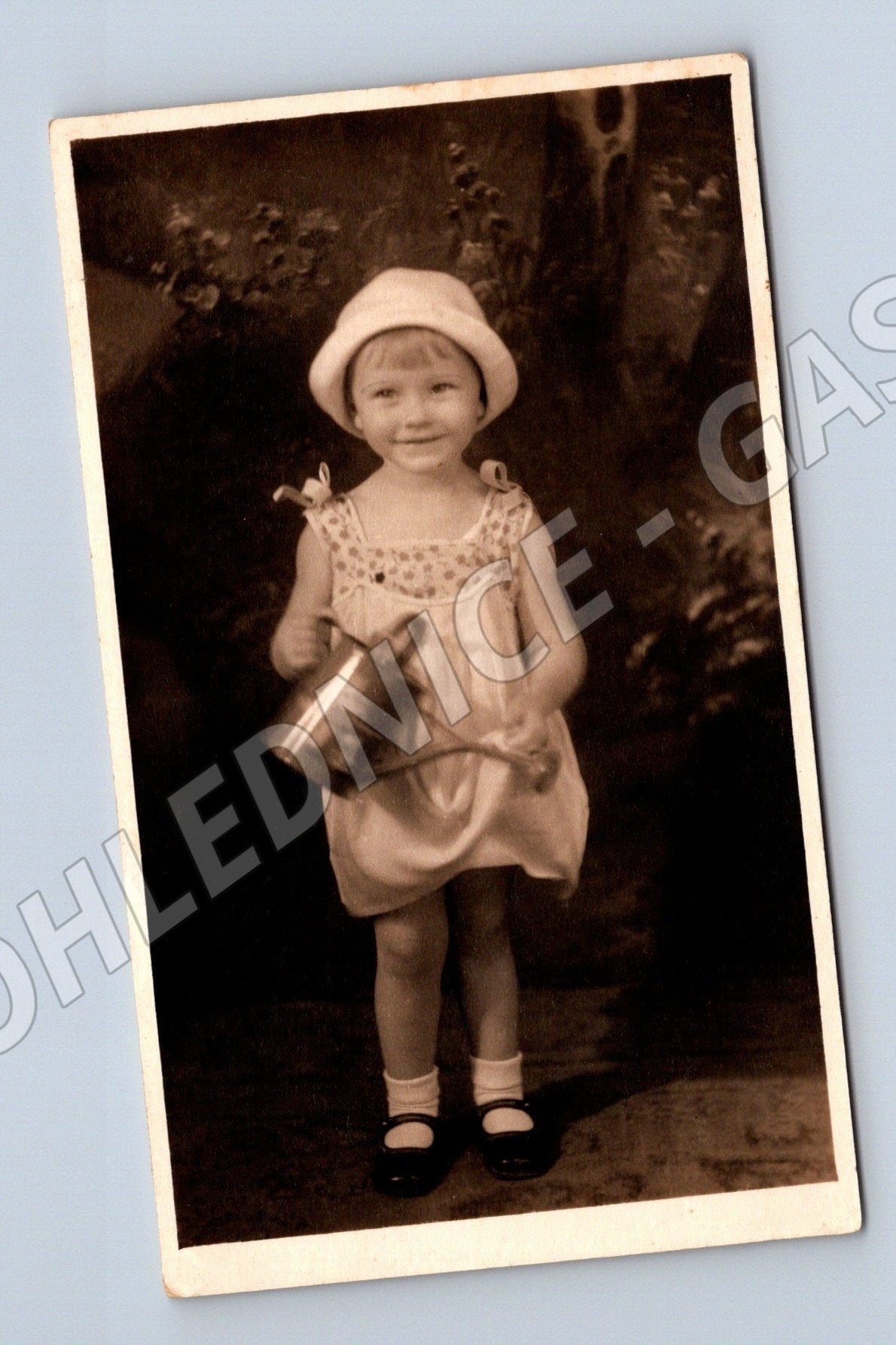 Přední strana zobrazuje malé dítě s kloboukem a kbelíkem. Dítě se usmívá do objektivu. Fotografie je v odstínech sépie.