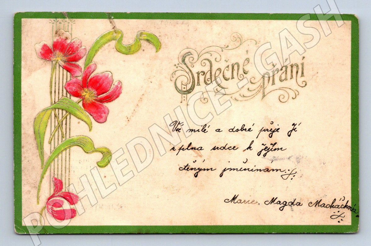 Nabízím starou českou pohlednici s nápisem Srdečné přání a květinovou dekorací v levé části. Pohlednice obsahuje ručně psaný text ve staročeském stylu a je očíslována zeleným rámečkem. Na zadní straně je razítko, známka a krátký dopis. Pohlednice je ve stavu odpovídajícím stáří, s viditelnými známkami používání a patinou. Ideální k doplnění sbírky starých českých pohlednic či jako vintage sběratelský kousek.