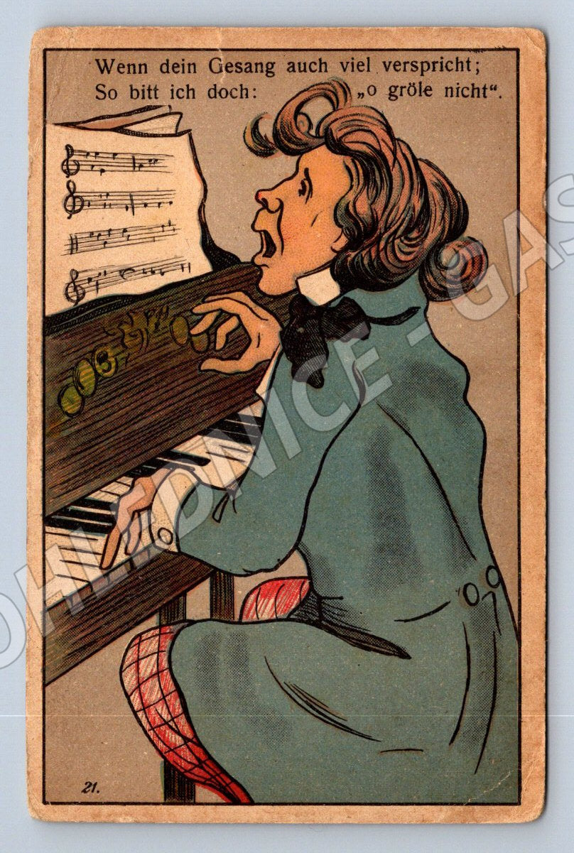 Starší barevná pohlednice s humorným nebo satirickým motivem zobrazujícím muže hrajícího na klavír a zpívajícího. Pohlednice je napsána německy a je vhodná pro sběratele etnografických a historických pohlednic. Stav pohlednice je viditelně opotřebovaný s patinou, což svědčí o její stáří a autentičnosti.