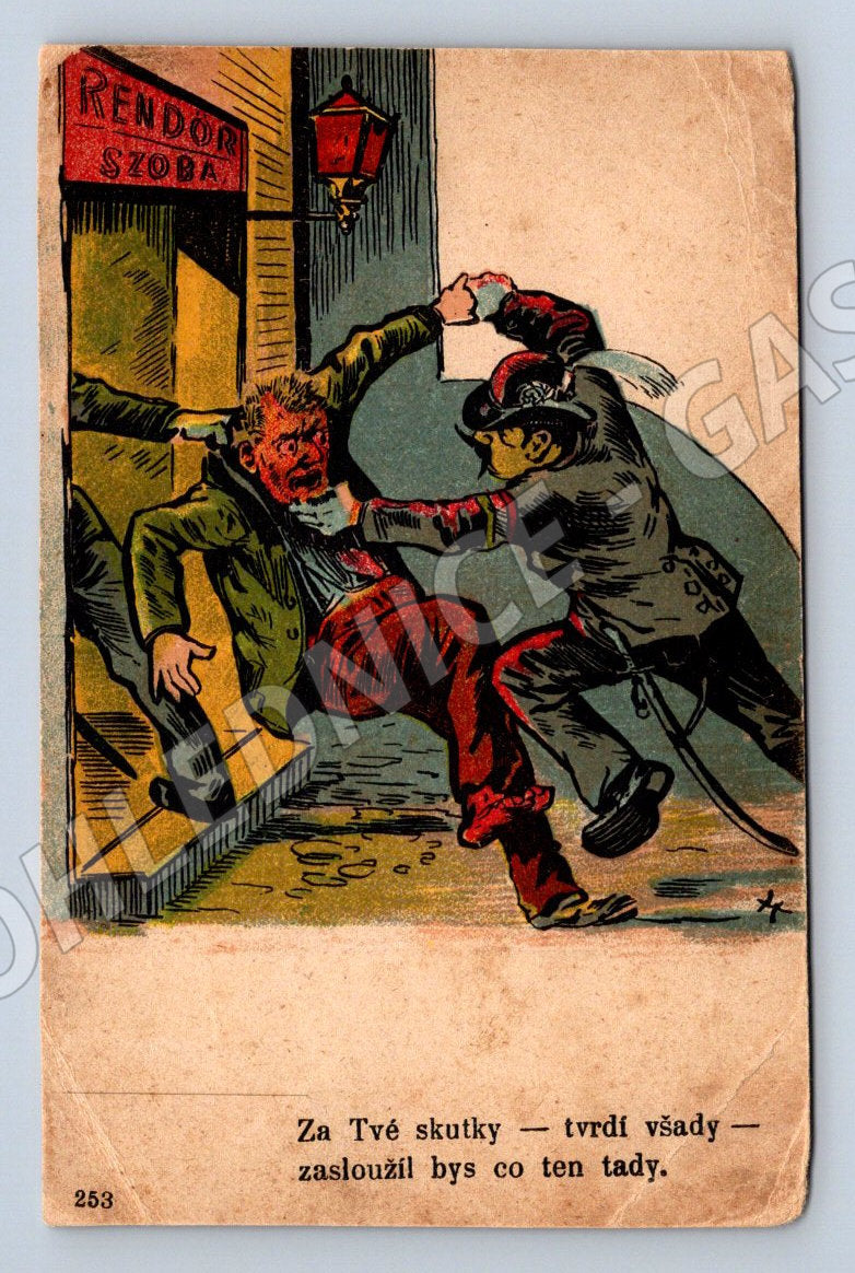 Starší retro pohlednice zobrazující scénu z života policejního zásahu, na které policista zatýká opilého muže před budovou označenou označením Rendőr Szoba (policejní místnost). Obrázek je barevně výrazný a zachycuje humoristickou situaci s nápisem v češtině: Za Tvé skutky — tvrdí vsády — zasloužil bys co ten tadý. Pohlednice je použita, s viditelným opotřebením a zažloutlými okraji, což dodává autentičnost a historickou hodnotu. Na zadní straně je označení Dopisnice a prostor pro adresu a zprávu. Ideální pro sběratele retro a humoristických pohlednic s motivem ostatní dopravy a života ve městě. Stav: použité, běžné známky opotřebení, roh mírně poškozený. Rozměry: standardní formát pohlednice. Kategorie je řazena mezi pohlednice týkající se dopravy, i když především jde o policejní zásah, nelze ji přesně zařadit do jiných kategorií dopravy jako železniční nebo silniční, proto je vhodná k zařazení do kategorie Pohlednice - ostatní doprava.