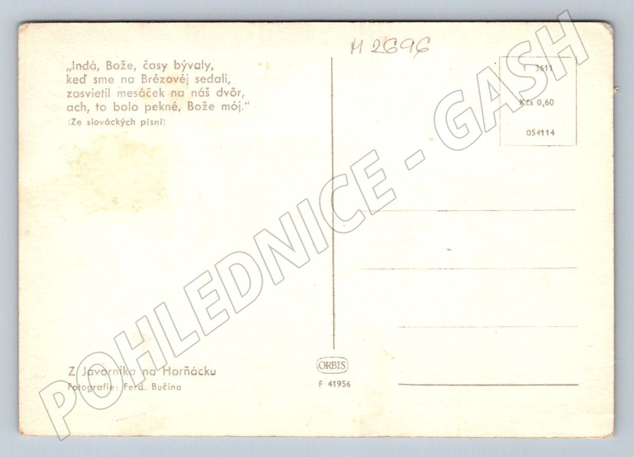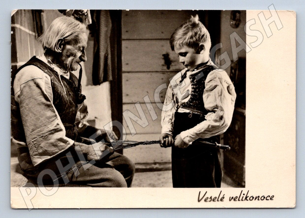 Starší černobílá pohlednice s názvem Veselé velikonoce zachycuje scénu z tradičního českého nebo moravského venkova. Na snímku je starý muž a malý chlapec, oba v lidových krojích, kteří si předávají nebo drží velikonoční pomlázku. Pohlednice nese nápis citátu ze slováckých písní a fotografie je označena jako zachycující scénu Z Javorníka na Horňácku , autorem fotografie je Ferd. Bučina. Pohlednice je vydána nakladatelstvím Orbis a má klasické zadní dělení pro adresu a zprávu. Jedinečný kus pro sběratele etnografických a folklórních pohlednic z Česka.