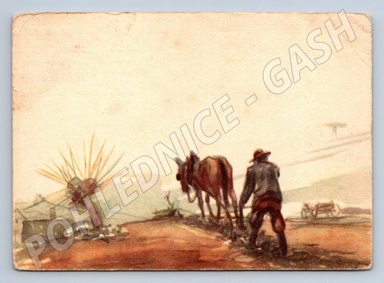 Tato velikonoční pohlednice od Aloisa Hejla zachycuje tradiční venkovskou scénu s oráním pole taženým dvěma koňmi za svítání nebo západu slunce. Kresba zobrazuje rolníka v kroji na poli, což vyzdvihuje českou lidovou kulturu a zemědělský způsob života. Pohlednice má na zadní straně připojený originální psaný pozdrav s datací roku 1965, odeslaný do města Písek. Razítko a známka z Československa podtrhují historický kontext. Celkový stav pohlednice je zachovalý s lehkými známkami stáří a použití, vhodné pro sběratele a milovníky etnografie či velikonočních tradic.