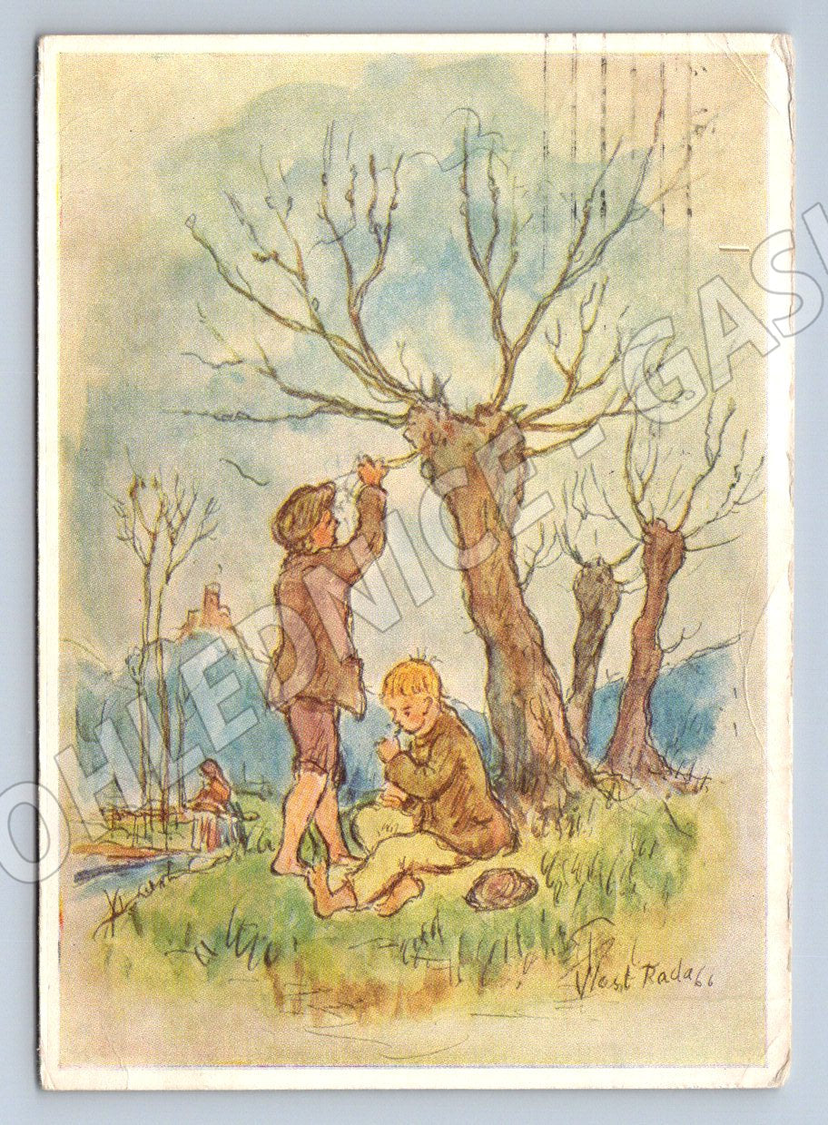 Tato pohlednice je barevnou kresbou, kterou vytvořil V. Rada. Zobrazuje venkovskou scénu s postavami dětí stojících u stromu s viditelnými detaily venkovské krajiny v pozadí a některými stavbami. Pohlednice je datována rokem 1967 a je odeslána z Prahy, což vidíme z poštovního razítka a známky Československo s portrétem Ignáce Josefa Pešiny. Na zadní straně je kratší ručně psaná věnování s přáním radostných Velikonoc. Pohlednice je v udržovaném stavu vzhledem k jejímu stáří, má okrajové známky používání, ale detail kresby i ručně psaný text jsou stále čitelné. Ideální sběratelský kousek pro milovníky etnografických motivů a historických pohlednic z období Československa.