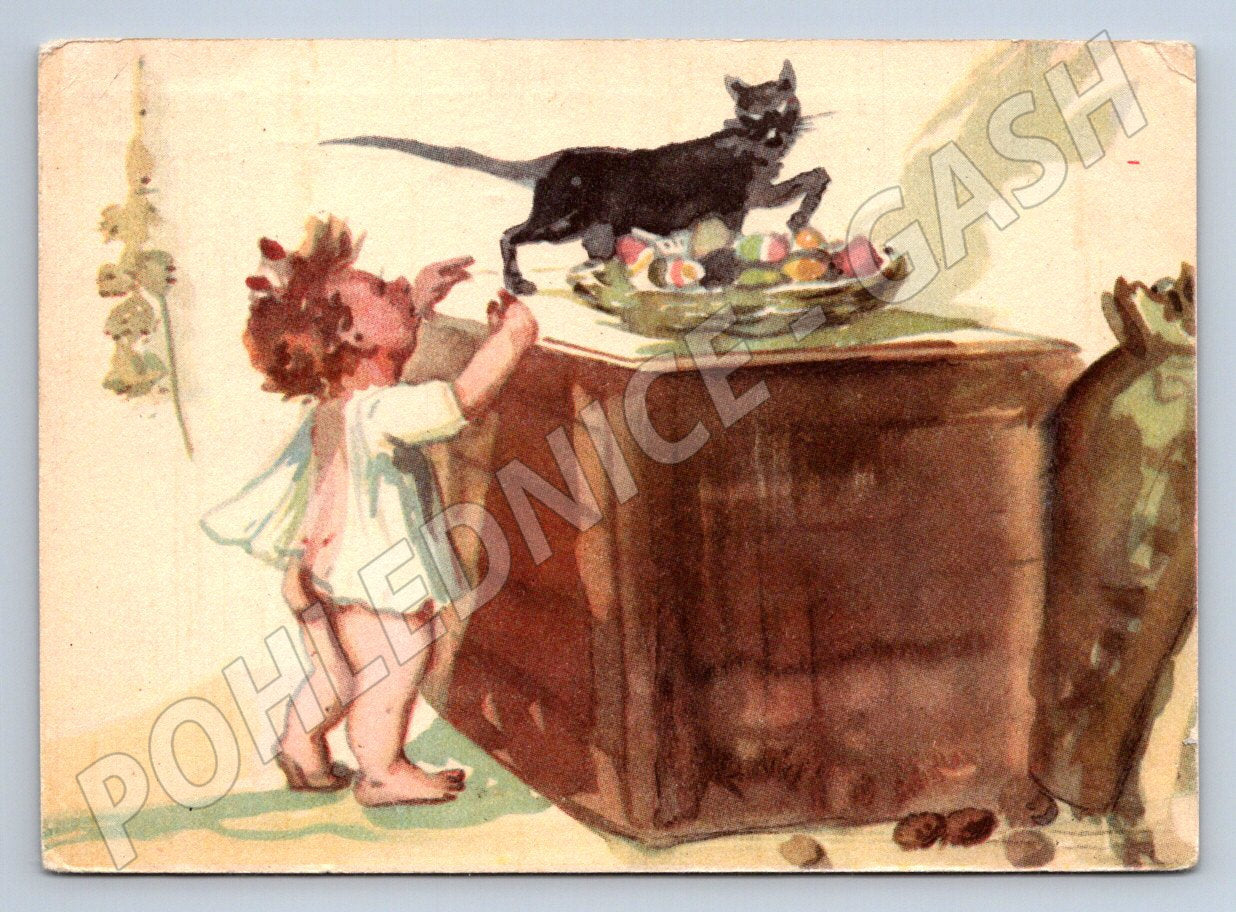 Nabízím k prodeji starou velikonoční pohlednici s ilustrací malého dítěte a černé kočky u misky s malovanými velikonočními vajíčky. Pohlednice je dopisní, zaslaná poštou, což dokládá razítko z Prahy z roku 1941 a známka Československa s portrétem. Na rubové straně je milý velikonoční pozdrav, podepsaný a adresovaný. Pohlednice je v hezkém stavu, drobné známky stáří viditelné, vhodná pro sběratele a milovníky etnografických předmětů či velikonočních motivů.