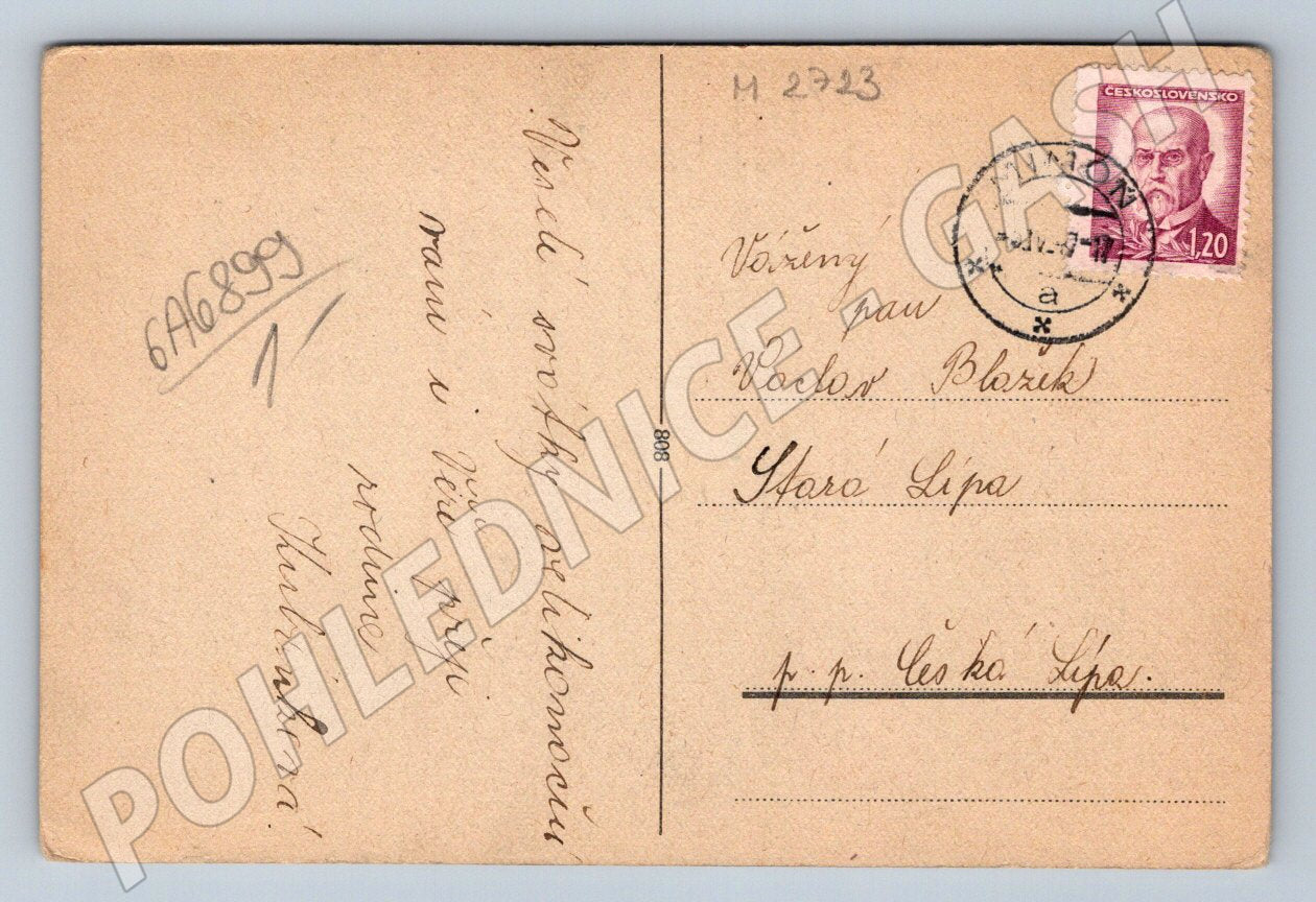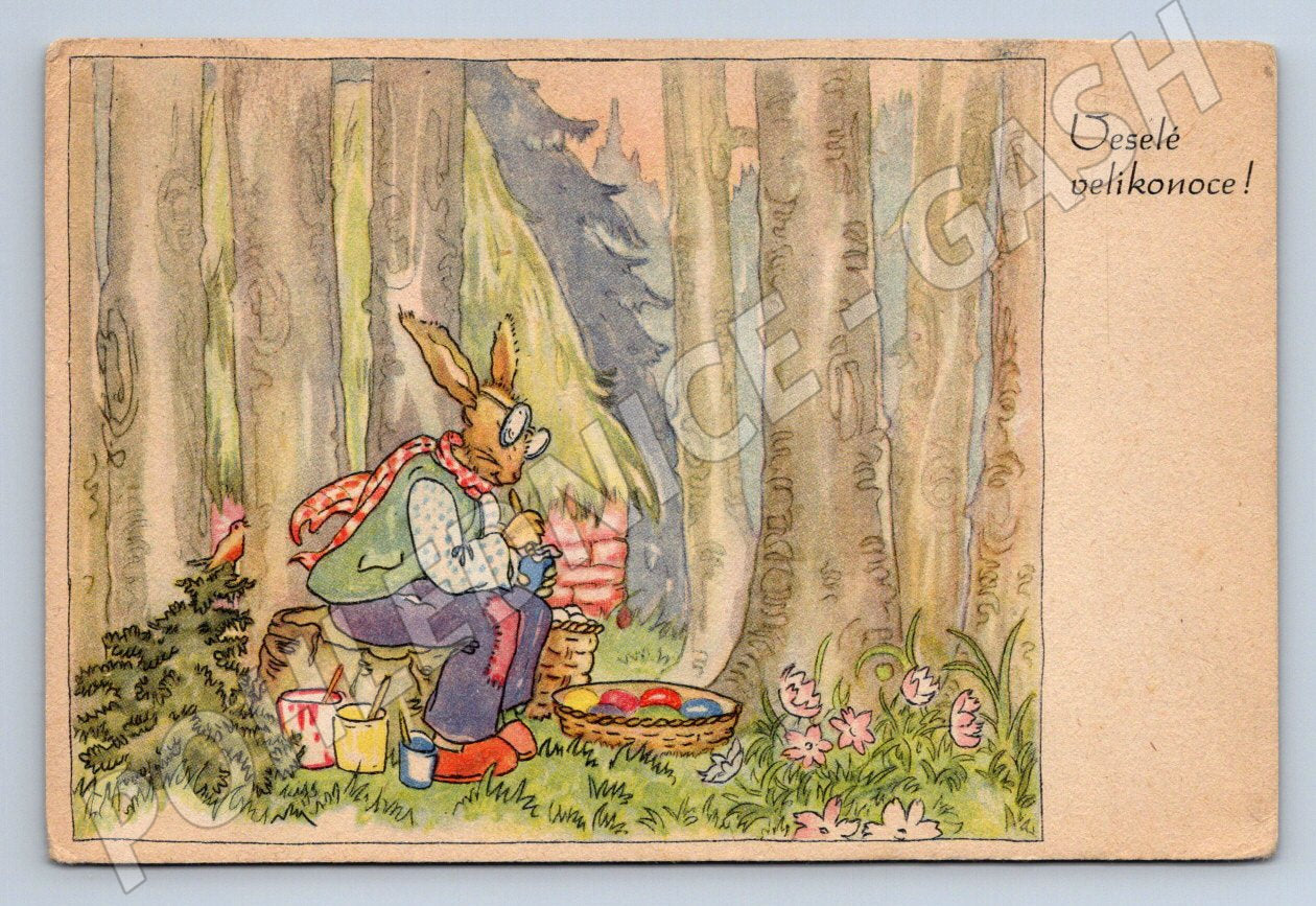 Tato vintage pohlednice z Československa zobrazuje okouzlující velikonoční ilustraci zajíce ve veselé atmosféře lesa, malujícího barevná vajíčka. Pohlednice nese tisk Veselé velikonoce! a je datována do období první poloviny 20. století, do roku 1950. Na zadní straně je přilepená poštovní známka Československa a razítko, pohlednice nese ručně psaný text a adresu. Jedná se o sběratelský kousek vhodný pro milovníky klasických českých velikonočních motivů a historických poštovních artefaktů. Stav je viditelný na fotkách, menší znaky patiny přidávají na autentičnosti.