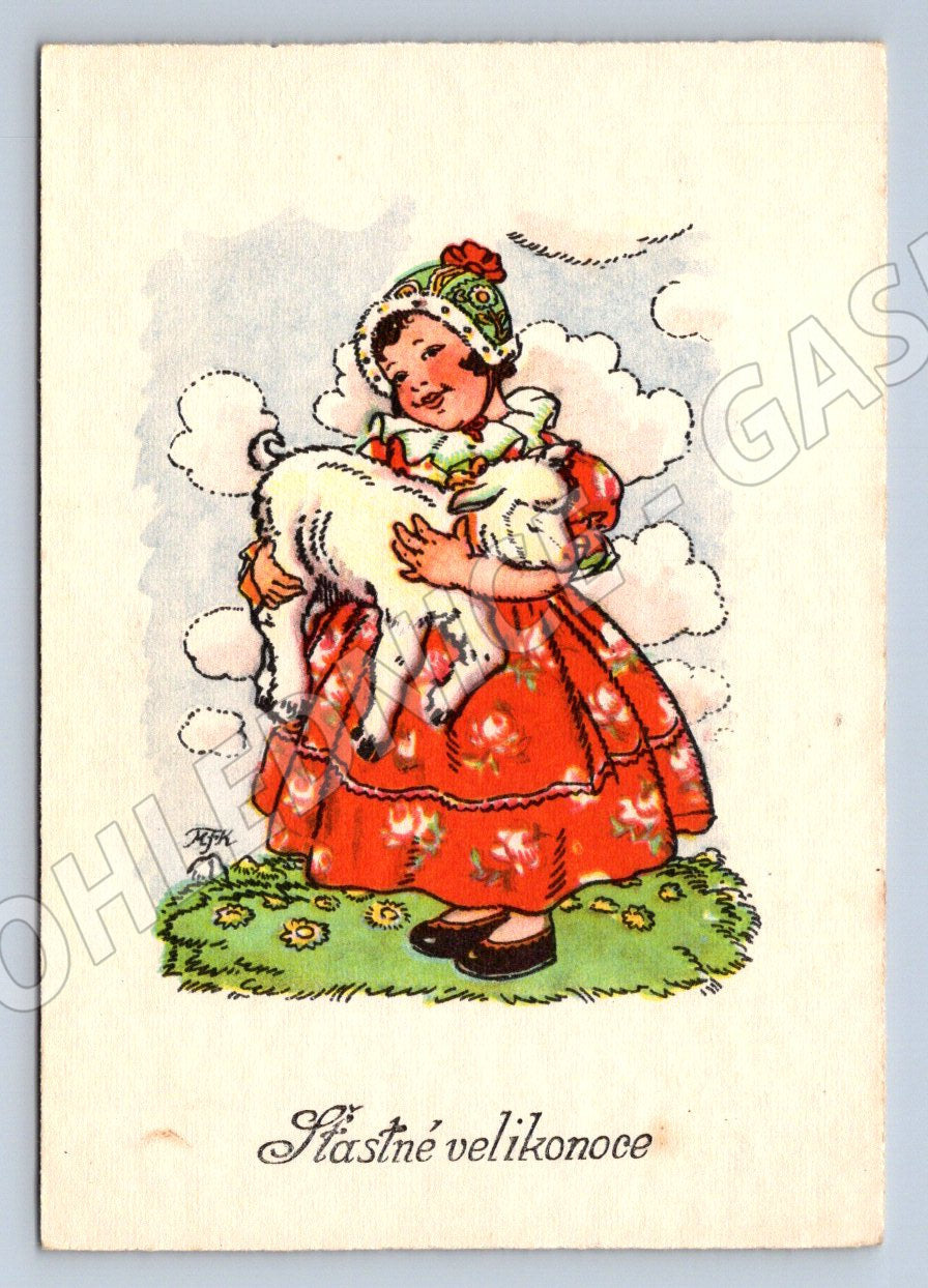 Velikonoční pohlednice s dívkou v kroji držící jehně - etnografie