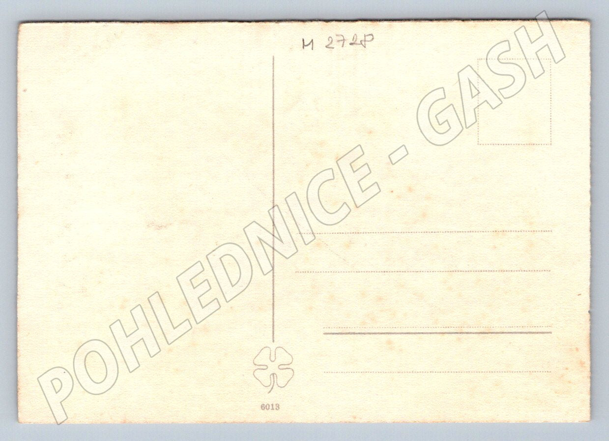 Tato vintage pohlednice zobrazuje malovanou postavičku dívky v tradičním kroji držící malé jehně. Pohlednice nese nápis Šťastné velikonoce , což naznačuje, že jde o velikonoční motiv. Obrázek je barevný a stylizovaný, evokuje lidovou tradici a folklór. Pohlednice je v dobrém stavu, bez poštovních značek, vhodná pro sběratele pohlednic a milovníky etnografie. Zadní strana je nevyplněná, připravená k posílání nebo uložení v kolekci.
