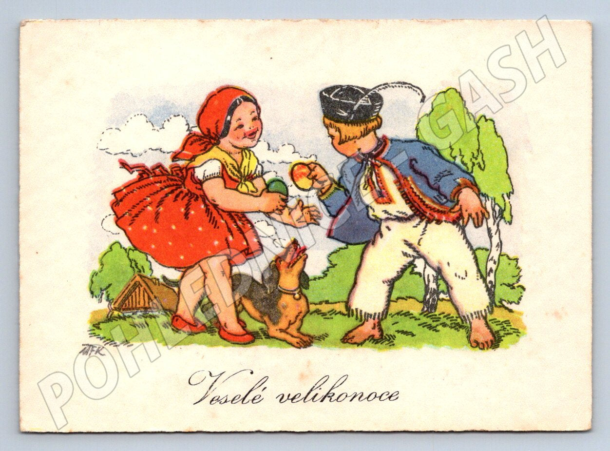 Pohlednice s tematickým motivem tradiční lidové kultury a velikonočních zvyků. Na přední straně je kresba děvčete v červeném kroji a chlapce v lidovém oděvu, kteří si podávají malovaná velikonoční vajíčka. U nohou chlapce je malé štěně, vše v přírodním prostředí s nápisem Veselé velikonoce . Pohlednice není použita, zezadu je určena k adresování a odeslání, ale žádné psané sdělení nebo známka na ní není. Pohlednice je ve standardním formátu a zachovalém stavu s mírnými známkami stáří. Velmi zajímavý sběratelský exemplář lidové tradice a velikonočních oslav.