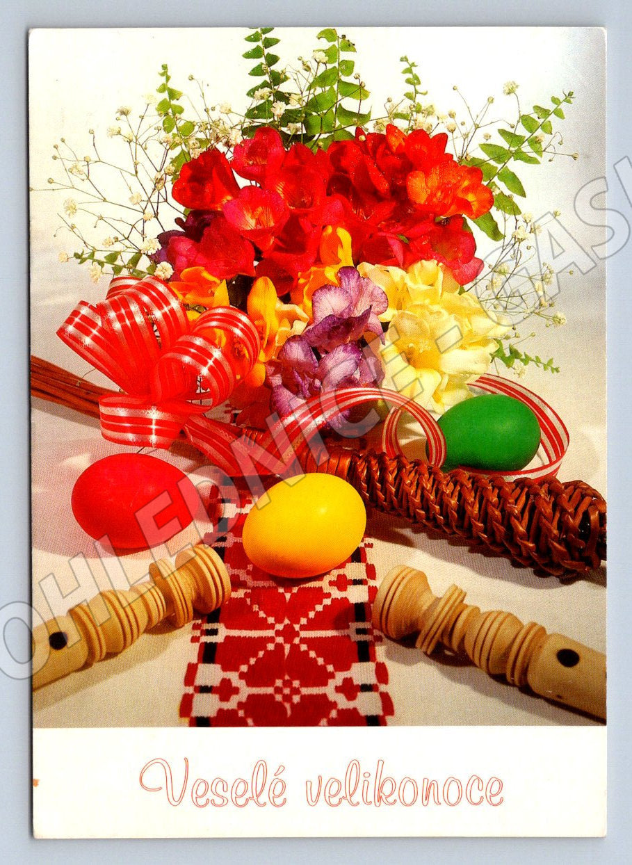 Tato krásná pohlednice přináší tradiční velikonoční motivy s pestrými barevnými kraslicemi, květinami a folklórními prvky. Na fotografii jsou barevné vajíčka, červená stužka, květiny a dřevěné ozdoby, které vzbuzují autentický dojem české velikonoční výzdoby. Pohlednice je adresována a obsahuje poštovní známku s motivem velikonočního zajíčka, což ji činí zajímavým sběratelským kouskem i dokumentem lidové kultury. Ideální pro sběratele pohlednic i milovníky tradičních českých svátků. Stav pohlednice je velmi dobrý, zachovalá oboustranně, s ručně psaným textem a razítkem z roku 1999. Vydavatelství Pohlednic Zlín, foto K. Antalík.