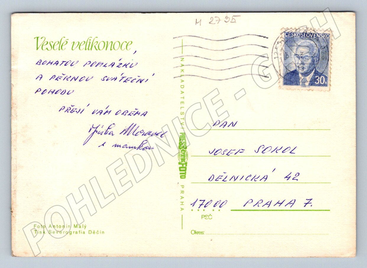 Nabízím starší pohlednici z České republiky ve větším formátu, na přední straně je fotografický motiv jarního listnatého lesa s vrbami a břízami, které prosvítají pod jasně modrou oblohou. Pohlednice je datována do období po roce 1950, což potvrzuje použitá poštovní známka Československa s portrétem T. G. Masaryka a označení tiskárny Severografia Děčín. Na zadní straně je napsané velikonoční přání, což dává pohlednici specifický sváteční charakter. Pohlednice je v zachovalém původním stavu, s drobnými známkami používání na okrajích, vhodná pro sběratele nebo milovníky nostalgických velikonočních pohlednic.