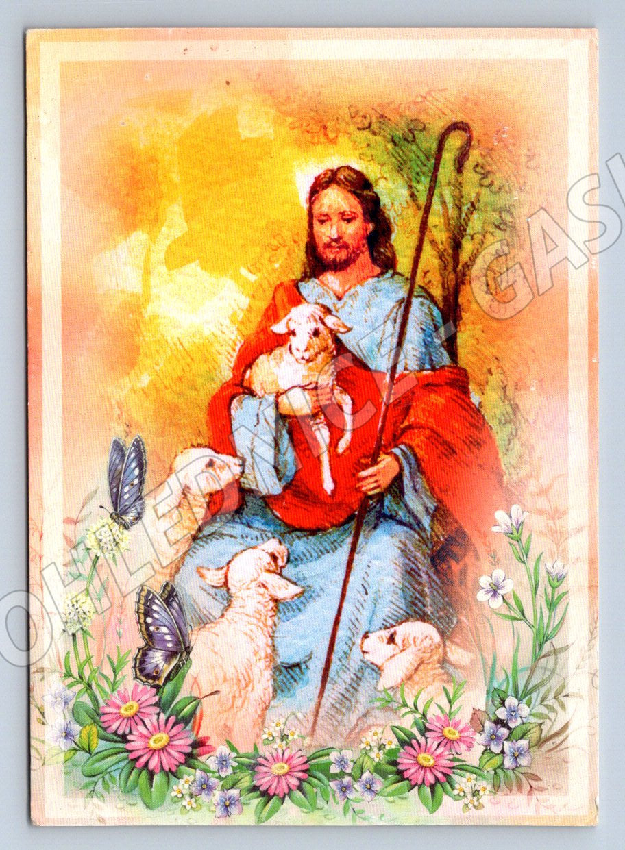 Nabízím k prodeji krásnou pohlednici s vyobrazením motivu pastýře s ovcemi, které drží v náručí beránka a je obklopen květinami a motýly. Pohlednice je barevná, s jemnými detaily a vytváří klidnou a příjemnou atmosféru. Na zadní straně je prostor pro adresu a případný dopis, značená známka s logem BP a čárový kód. Stav pohlednice je viditelně zachovalý s drobnými známkami stáří. Ideální pro sběratele pohlednic s náboženskou a etnografickou tematikou.