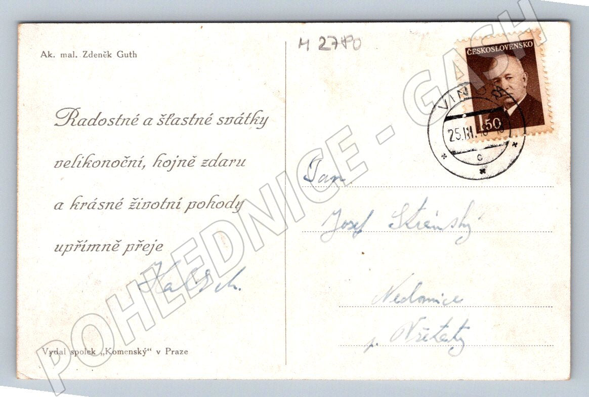 Nabízím k prodeji vintage pohlednici s velikonočním motivem, kterou namaloval akademický malíř Zdeněk Guth. Pohlednice zobrazuje tradiční zvyk pásového honění s postavou pastýře a jeho stádem ovcí u modlitební kapličky zdobené velikonočním věncem. Text na zadní straně přeje radostné a šťastné velikonoční svátky, hodně zdraví a životní pohodu. Pohlednice je opatřena československou známkou a poštovním razítkem s datem 25.III.1950. Pohlednice je v slušném zachovalém stavu s mírnými otřepy na krajích a drobnou vadou na rohu. Výjimečný sběratelský kousek s etnografickým motivem velikonočních tradic v Čechách.