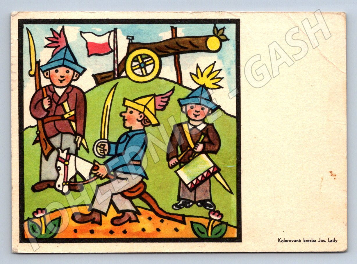 Vintage pohlednice Josef Lada - lidoví vojáci s meči a bubínkem