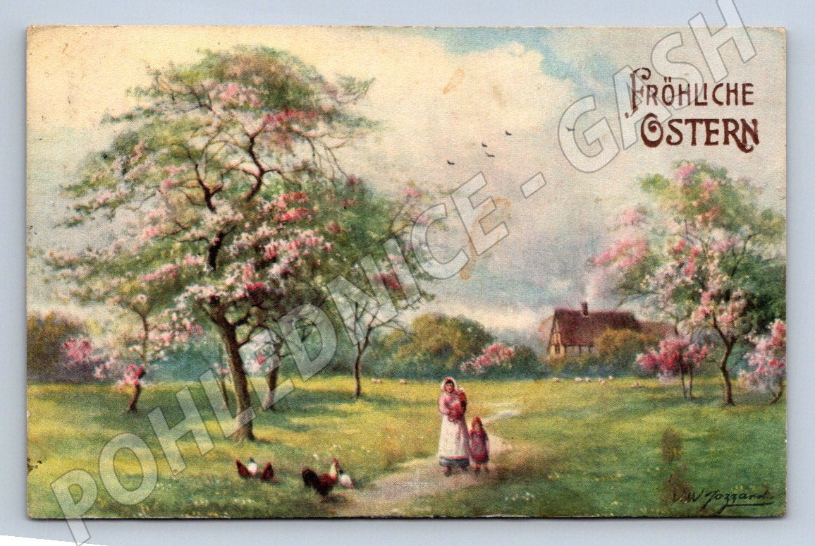 Nabízím k prodeji starou pohlednici z 30. let 20. století s přáním Fröhliche Ostern (Veselé Velikonoce) v německém jazyce. Pohlednice zobrazuje jarní venkovskou krajinu s kvetoucími stromy, cestou, na které kráčí žena s dítětem, a poblíž několik slepic. Pohlednice je opatřena československou známkou a poštovním razítkem, dopis je adresován a psán ručně. Stav pohlednice je patrný na fotografii, s mírnými známkami stáří a opotřebení typickými pro sběratelské předměty této doby. Výjimečný sběratelský kousek pro milovníky historických pohlednic a etnografických motivů.