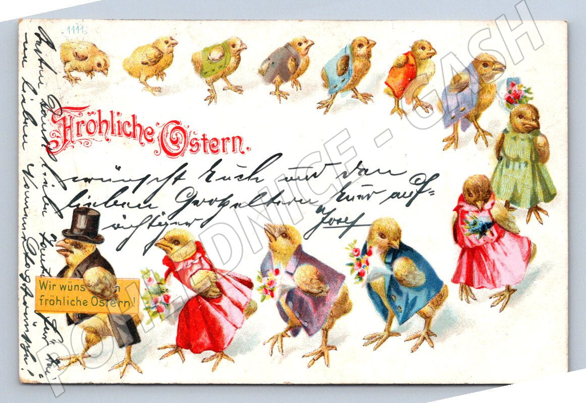 Nabízím sběratelskou pohlednici s velikonoční tematikou z počátku 20. století. Na přední straně jsou jemně ilustrovaná kuřátka v kostýmech a pestrých šatech, ozdobená květinami, včetně kuřete s cylindrem a dalšími v barevných kabátcích. Pohlednice nese německý text Fröhliche Ostern (Veselé Velikonoce). Na zadní straně je poštovní razítko Praha s hodnotou známky 5 heller. Pohlednice je psaná rukou, zajímavá pro sběratele historických velikonočních motivů a starých evropských pohlednic. Stav odpovídá stáří, drobné známky opotřebení pouze kosmetické, bez zásadních poškození.