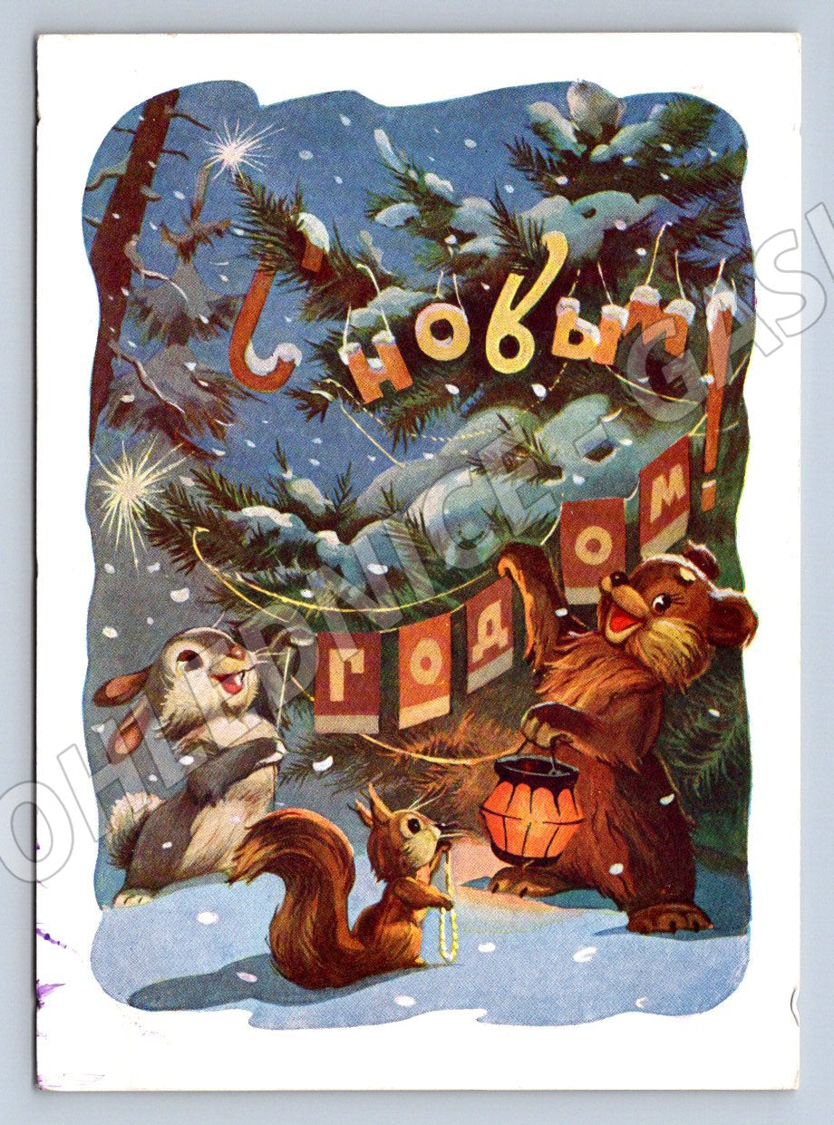 Tato sovienská novoroční pohlednice z roku 1961 zobrazuje roztomilá zvířátka - medvěda, veverku a zajíce - u zimního smrku pokrytého sněhem, s přáním С Новым годом (Šťastný nový rok). Pohlednice byla vydána Ministrestvem spojů SSSR a je podepsána umělcem I. Znamenckým. Na zadní straně je ručně psaný pozdrav a poštovní razítka. Pohlednice je ve velmi dobrém stavu, zajímavý sběratelský kousek sovětské etnografie a vánočních tradic.